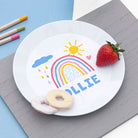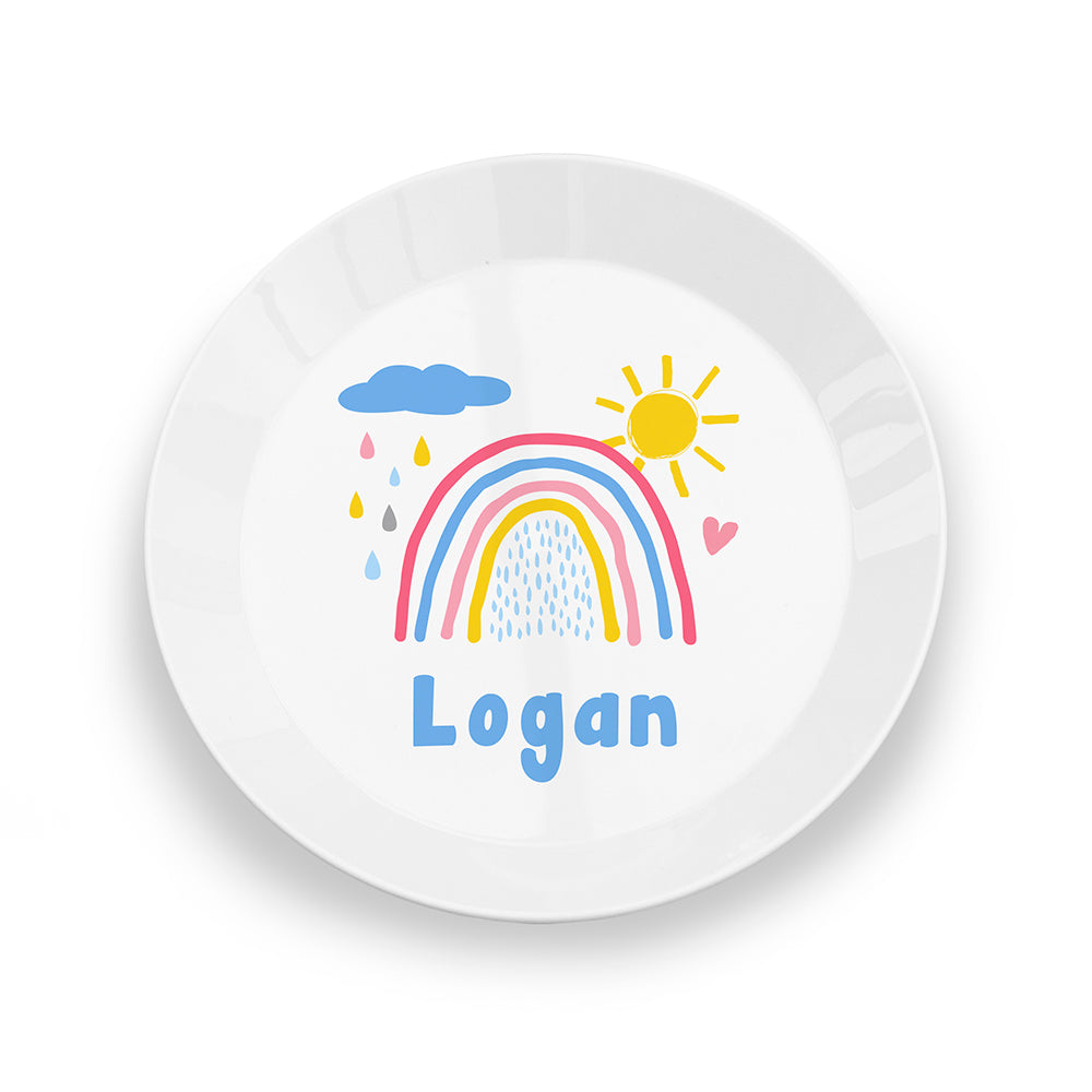 Their personalised white plastic plate comes adorned with a beautiful pastel skyscape design as standard, consisting of colourful rain, a shining sun which is sure to brighten up everyone's day and a cute rainbow design in the centre of the plate. Your child's plate is made to last, so it can withstand almost anything even the most excitable of eaters can throw at it and will make an amazing gift for any occasion that they're bound to want to use everyday.