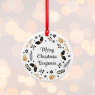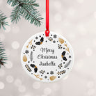 ‘Merry Christmas’ comes in a black script font in the centre of the ornament with your personalisation underneath. This is encircled by a nordic Christmassy floral design featuring beautiful acorns and holy leaves. This simple yet elegant design is sure to complement any Christmas tree.