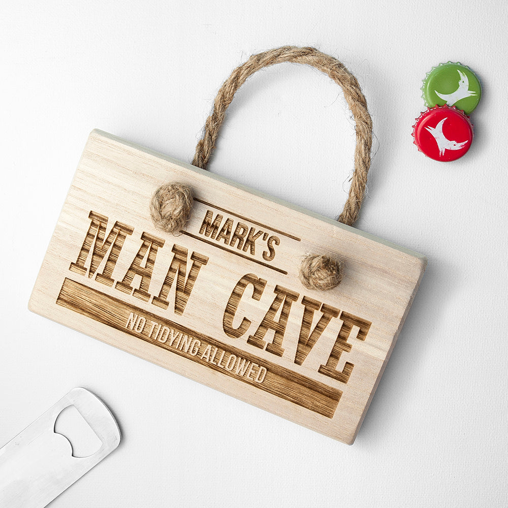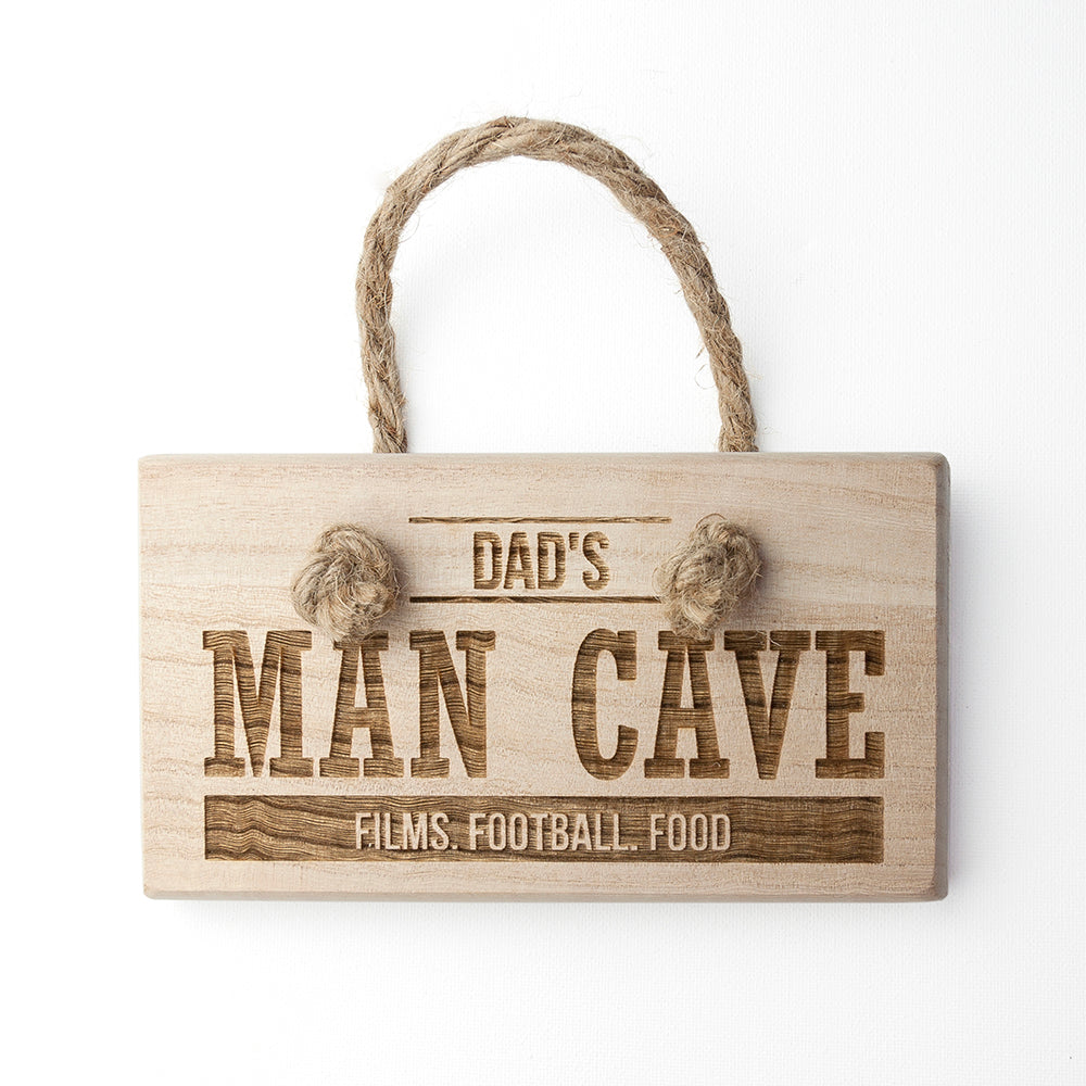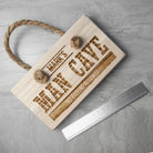 If you know someone who has their very own Man Cave, our handcrafted personalised man cave wooden hanging sign is the perfect gift for him. A stunning hanging accessory for that special place or room that your loved one claims as his own territory. This stunning personalised man cave wooden sign is an ideal birthday gift for him or a cheeky Father’s Day gift for your dad, so he can hang it up in his special place and show it off to friends.