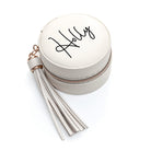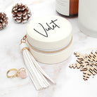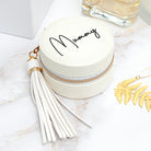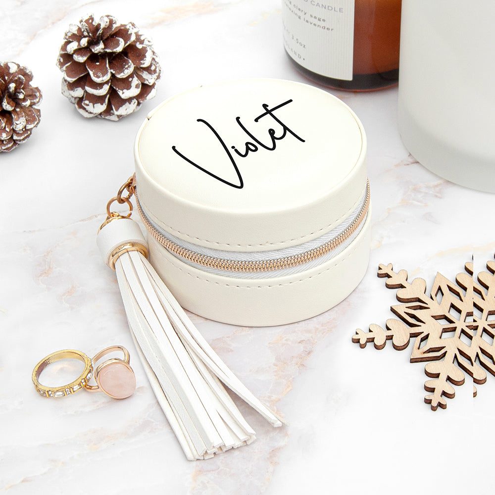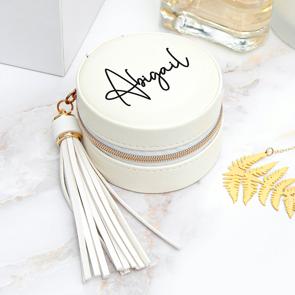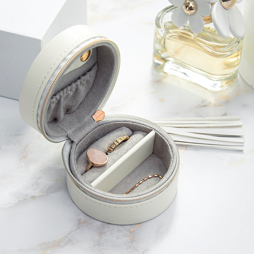 Your white round jewellery case comes with a sleek Treat Republic branding and gorgeous white tassel with gold metal trim as standard.