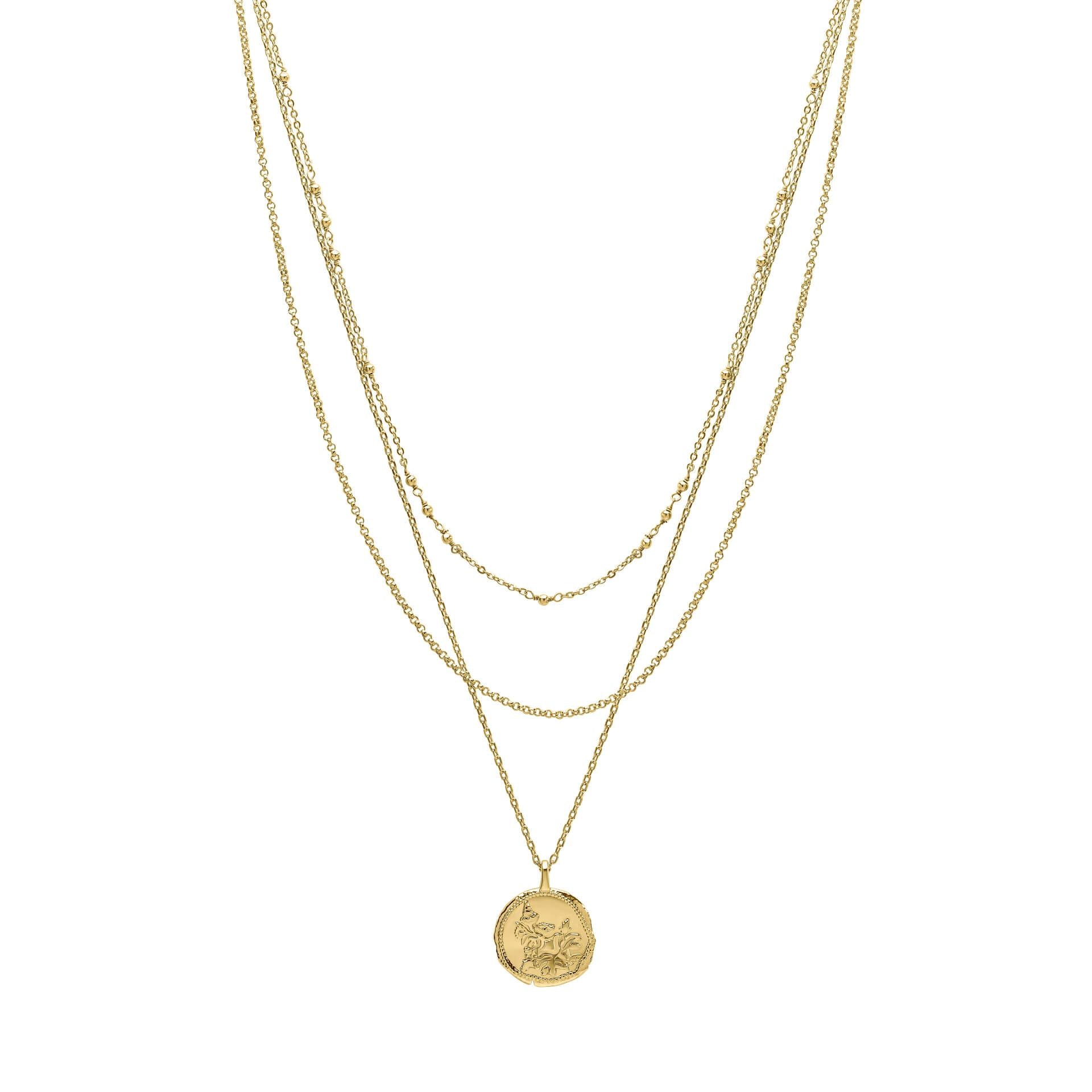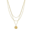 Crafted with meticulous care from high-quality gold-plated brass, this floral necklace showcases a lustrous polish that enhances its radiant finish and ensures lasting appeal. Its multi-layered design creates a graceful drape upon the neckline, composed of three finely crafted chains of varying lengths. The longest chain serves as the anchor for the centrepiece of the design; a beautifully ornate, round pendant.