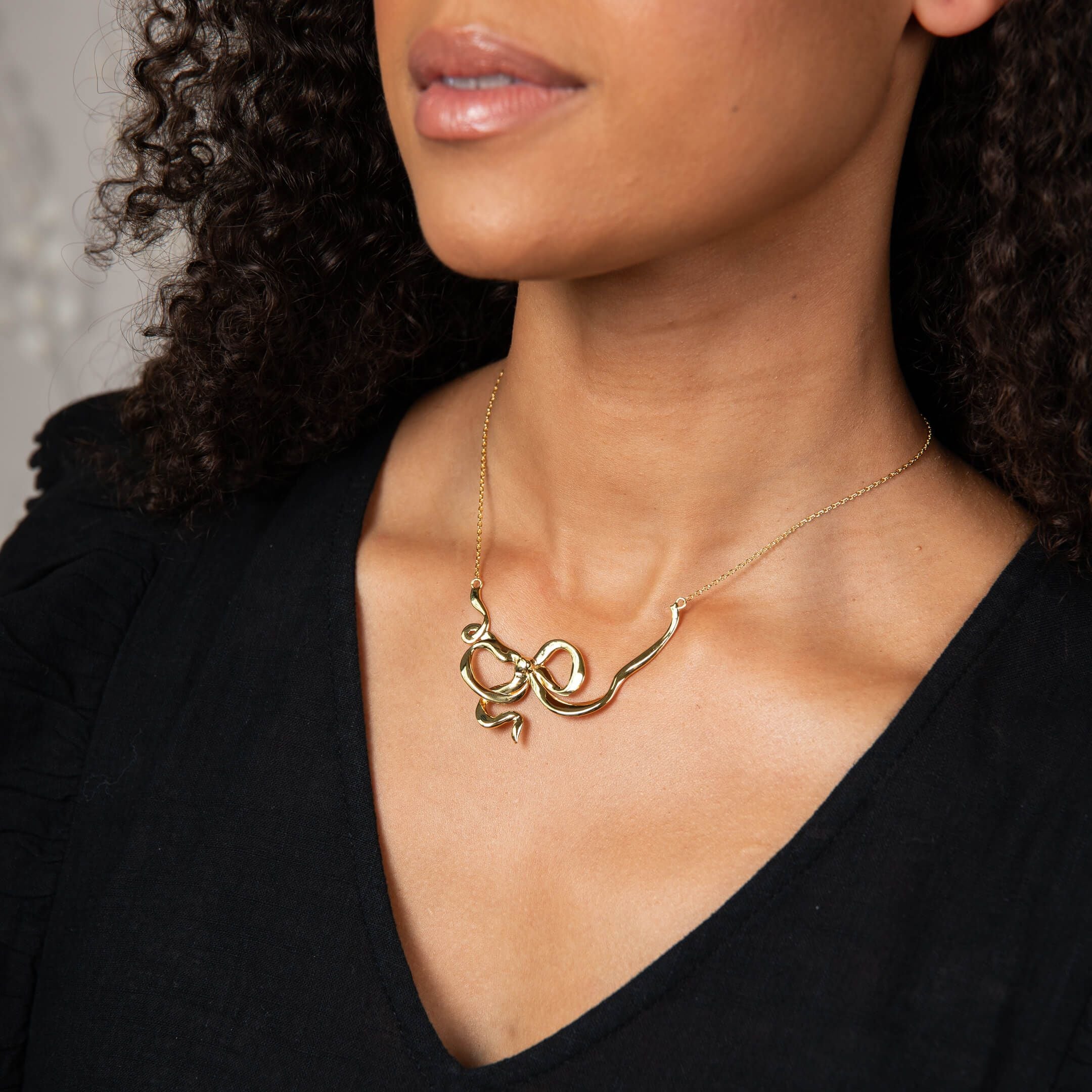 Its bow pendant rests beautifully against the neckline, making it a showstopping centrepiece that can be worn with effortless ease throughout the day and into the evening. Pair this delightful accessory with a simple blouse for understated daytime charm or style it with formalwear to create a captivating focal point that brings glamour and elegance to special occasions.