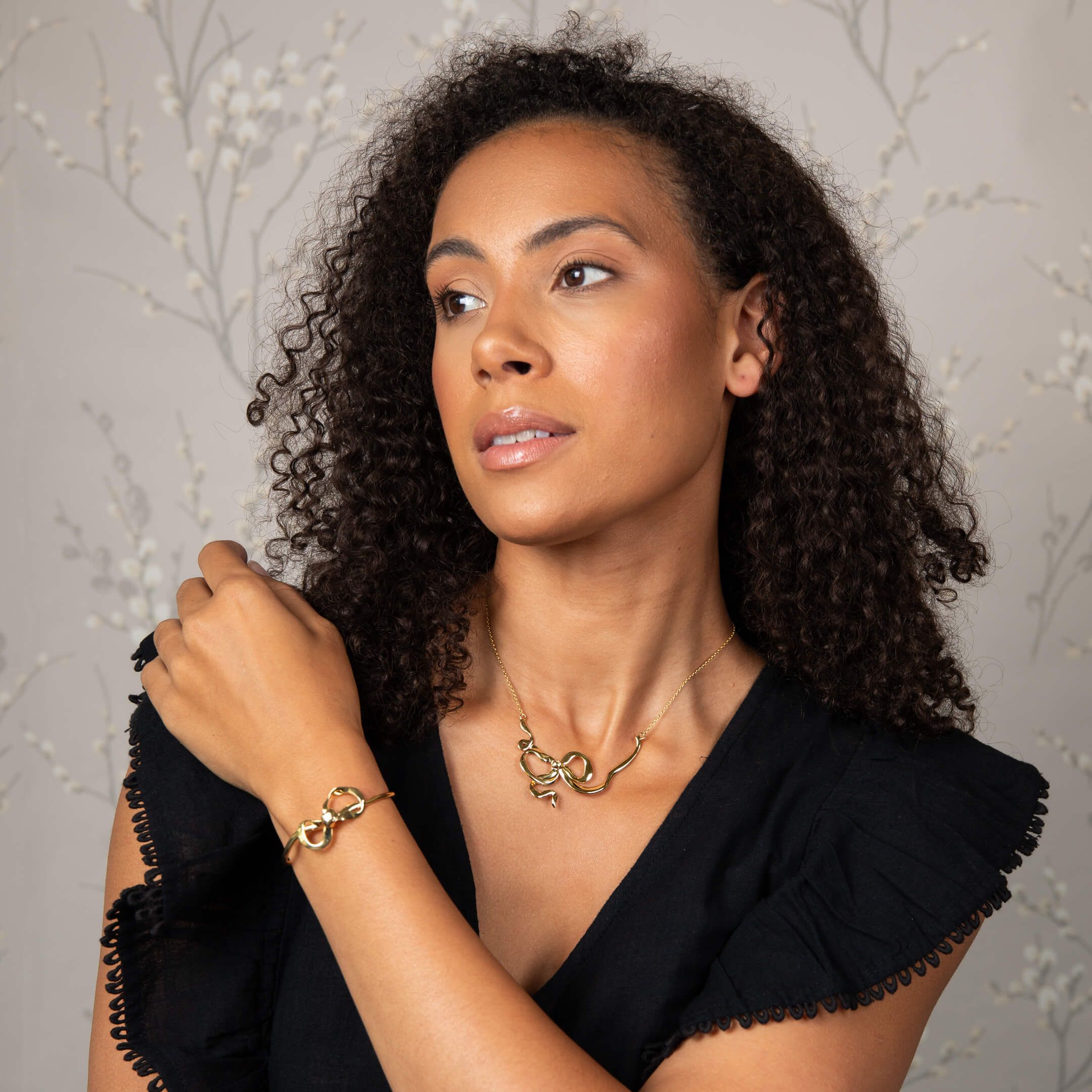 A striking piece of ladies jewellery, our breathtakingly beautiful Laura Ashley Gold Plated Statement Ribbon Bow Necklace perfectly captures the elegance and charm for which Laura Ashley is renowned. Designed in the form of a flowing ribbon bow, this graceful necklace embodies the harmonious blend of statement style and delicate detailing, offering a timeless accessory that radiates sophistication. Its sculpted curves and fluid form evoke the natural drape of a silk ribbon, while the polished gold-plated finish ensures a radiant lustre that instantly elevates any outfit.