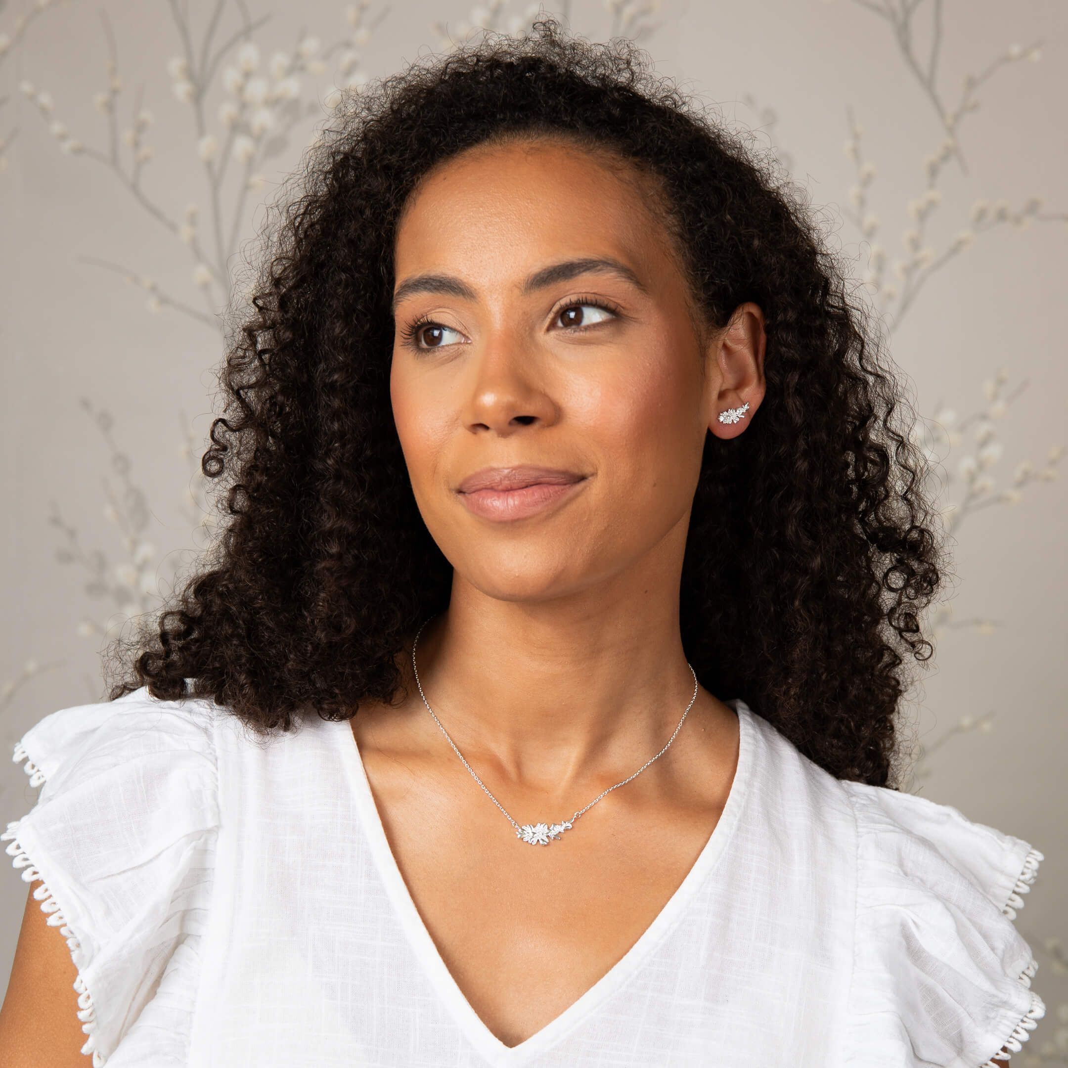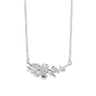 The centrepiece of the necklace features a graceful floral arrangement, reminiscent of blossoms freshly gathered from a meadow. Each petal and leaf is sculpted with meticulous attention to detail, some smooth and gleaming in polished silver plating, while others are adorned with a dusting of glittering crystals that provide a striking yet harmonious contrast. The composition is delicately balanced, with overlapping petals and curved leaves forming a naturalistic cluster that appears to bloom effortlessly from the fine silver chain. The fluidity of the design ensures it rests beautifully at the neckline, offering a flattering silhouette that complements both everyday wear and formal occasions.