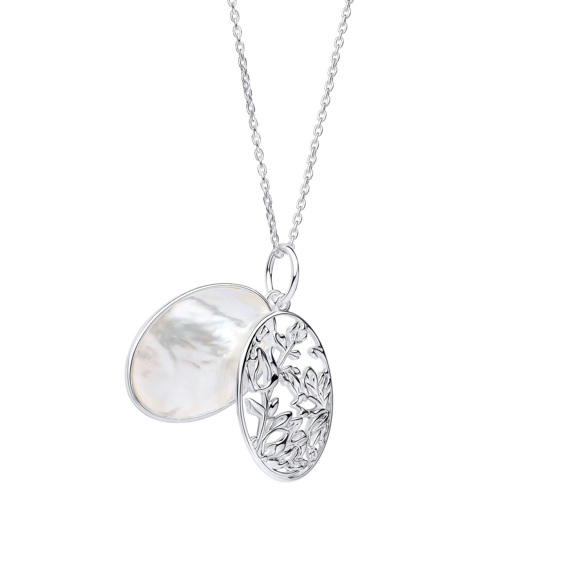 Suspended from a recycled sterling silver chain, the oval pendants balance classic femininity with modern craftsmanship, making it a versatile piece of neckwear that can be worn effortlessly with both formal attire and everyday ensembles. The intricate floral design not only evokes a sense of nature’s beauty but also carries a timeless quality, ensuring it remains a cherished accessory in any jewellery collection.