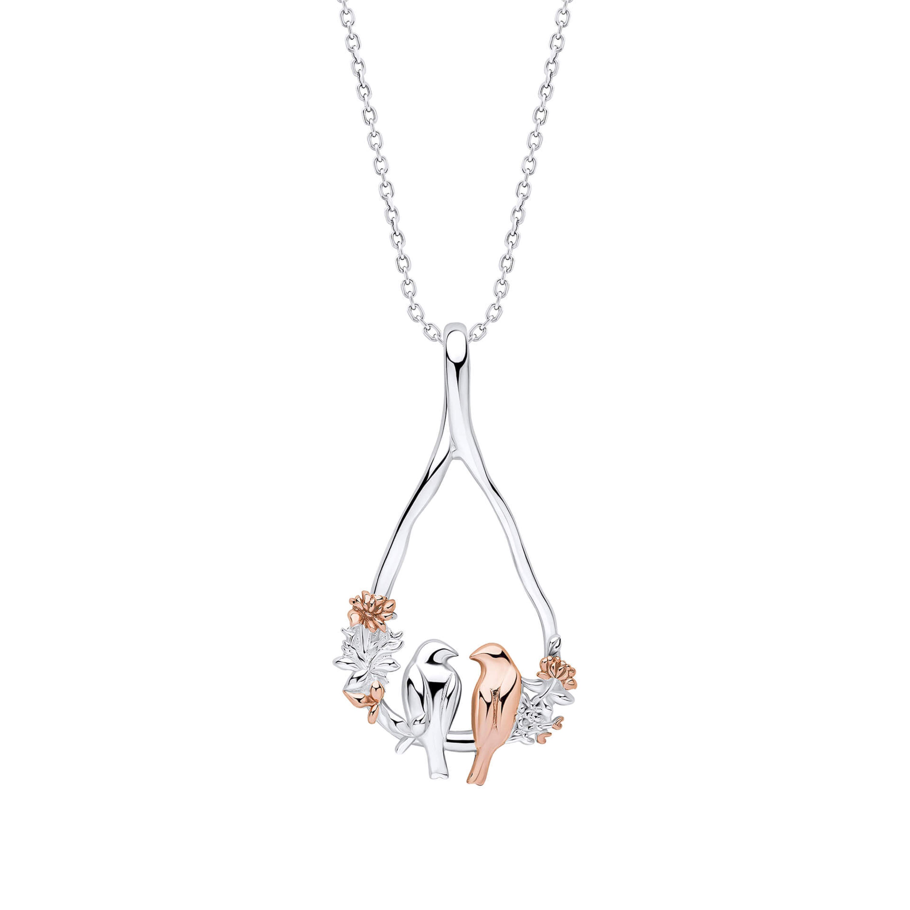 The pendant, gracefully suspended from a fine sterling silver chain, is masterfully crafted from high-quality sterling silver, reflecting a thoughtful approach to both craftsmanship. The design centres on a delicate wishbone-shaped bough, its softly arched form evoking serenity and grace. Nestled upon this bough are two meticulously sculpted love birds, one in polished sterling silver, the other softly blushed with rose gold plating, facing one another in peaceful companionship. Their poised, contemplative presence symbolises unity, devotion and the beauty of togetherness.