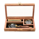 Housed within a beautifully crafted wooden hinged case, each element of the set has been carefully selected to evoke the spirit of exploration. The case itself is as much a part of the experience as the instruments within: solid for protection, tactile and attractively finished for style and presentation, making it ideal for display on a desk, bookshelf or study. Its compact design ensures that the set remains lightweight and effortlessly portable, allowing its owner to carry a sense of adventure wherever he may go.