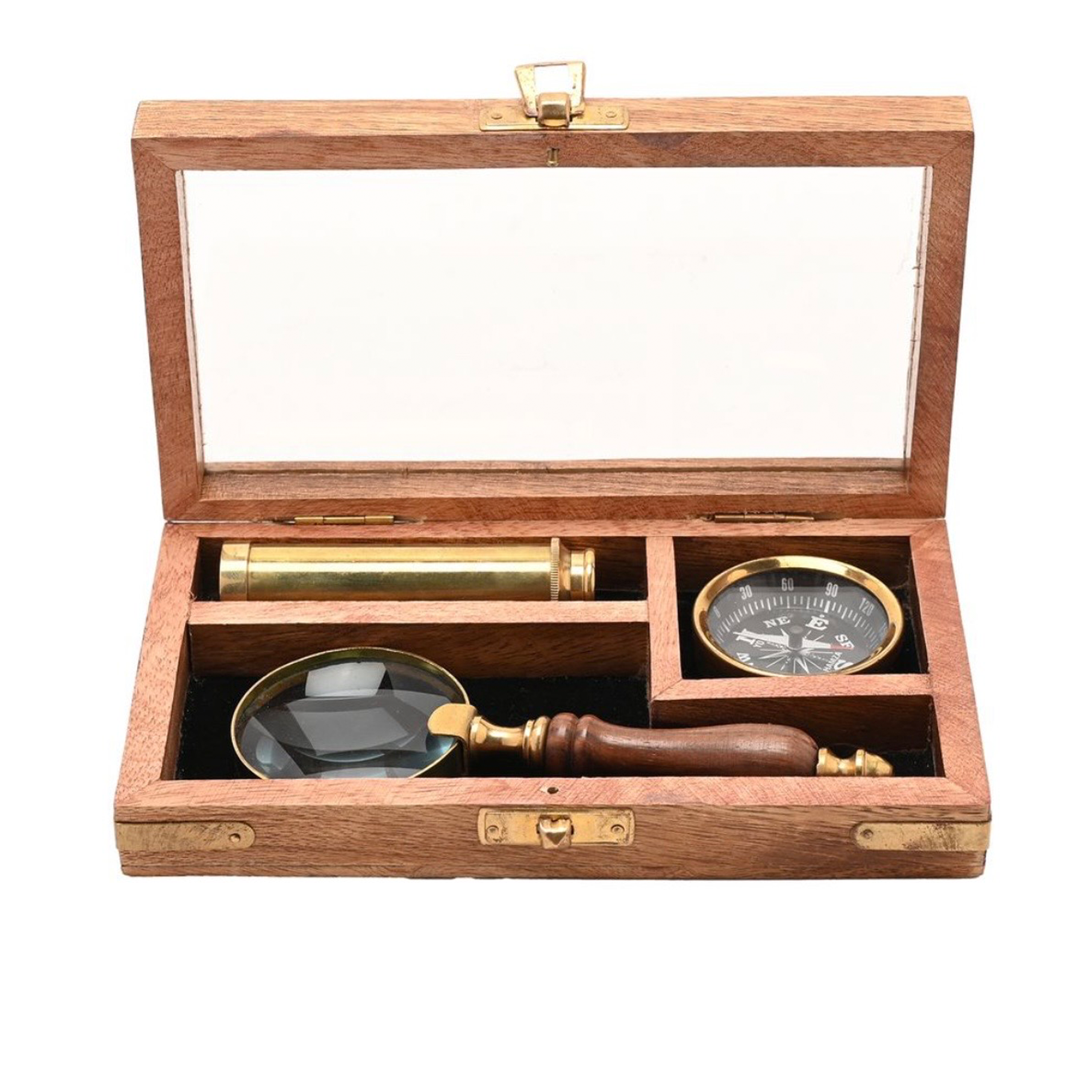 At the heart of the collection lies a finely made brass telescope, a nod to the great explorers and navigators of centuries past. Though small in size, it delivers a pleasingly authentic experience, extending smoothly to reveal its polished segments. Perfect for casual observation or as a decorative piece, it captures the romance of discovery and the enduring appeal of traditional craftsmanship.