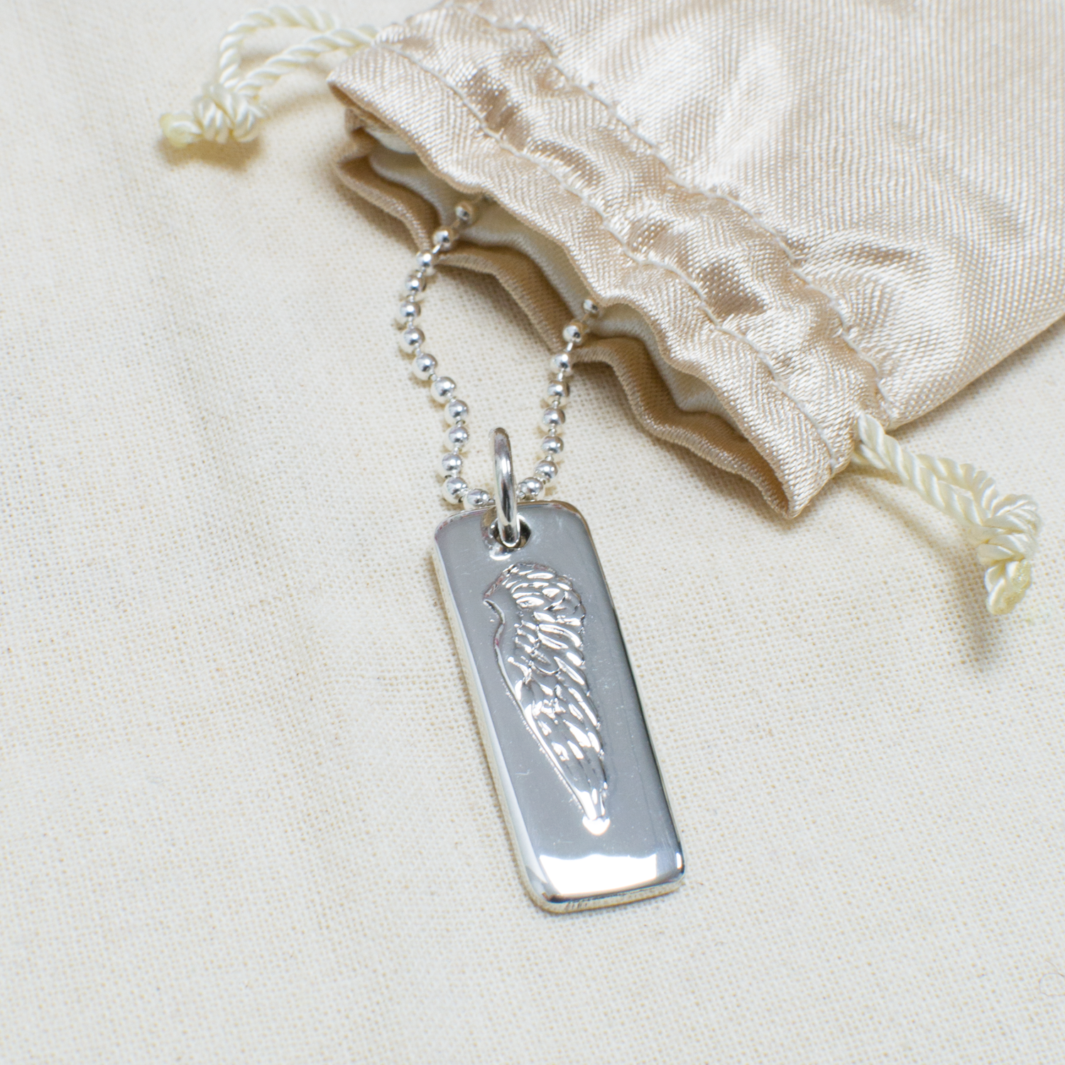 Elegance and quiet sentimentality combine to produce our thoughtful Personalised Sterling Silver Embossed Angel Wing Necklace. This beautifully considered piece of neckwear, crafted from sterling silver, features a rectangular pendant with a carefully raised angel wing design, embossed to create depth and texture across the polished surface. The clean, rectangular form lends the piece a contemporary refinement, while the softly detailed wing introduces a sense of grace and timeless symbolism.