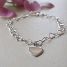 Completing the design is a softly polished heart charm, suspended elegantly from the bracelet. This solid sterling silver heart adds a focal point and reinforces the romantic meaning of the piece, representing the wearer’s own heart or the heart shared with a loved one. The charm’s smooth, reflective finish that enhances the bracelet’s understated sophistication while maintaining a charming and approachable character.