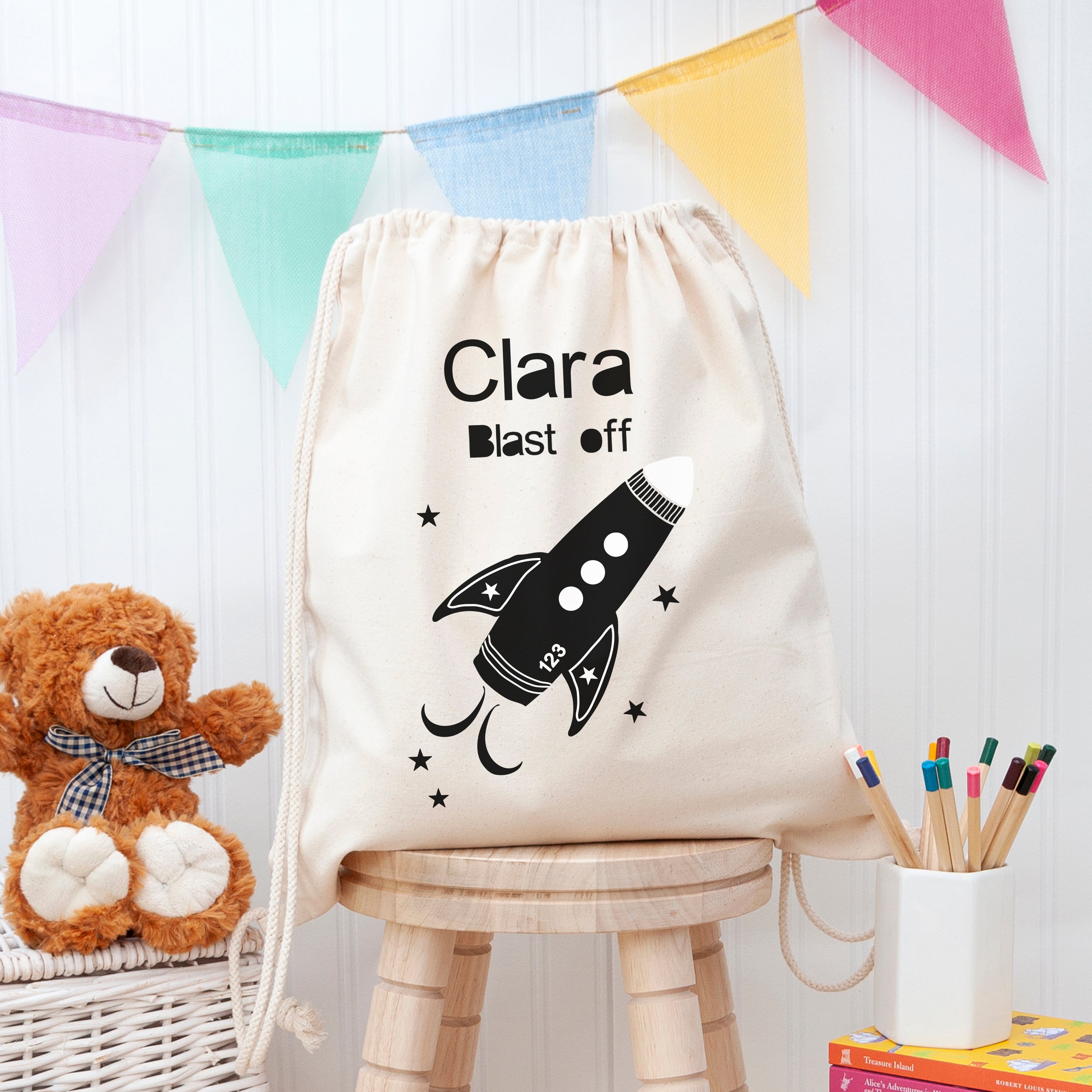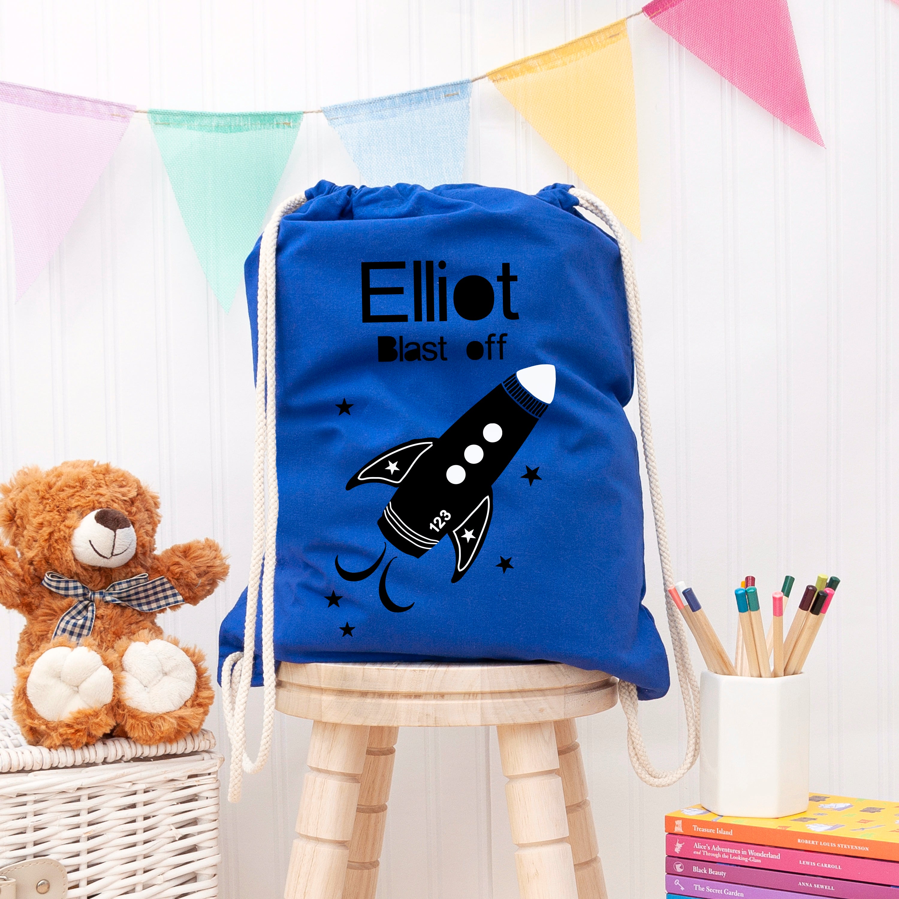 Prepare for a cosmic adventure as your little ones blast off into the world of active play with our out-of-this-world Personalised Children's Space Rocket PE Kit Bag. The perfect birthday, Christmas or new school present for a budding astronaut. Their PE kit bag is made from high quality cotton, meaning their sports accessories can be transported securely to infinity and beyond! Plus, it can handle the rough and tumble of any young astronaut’s day.