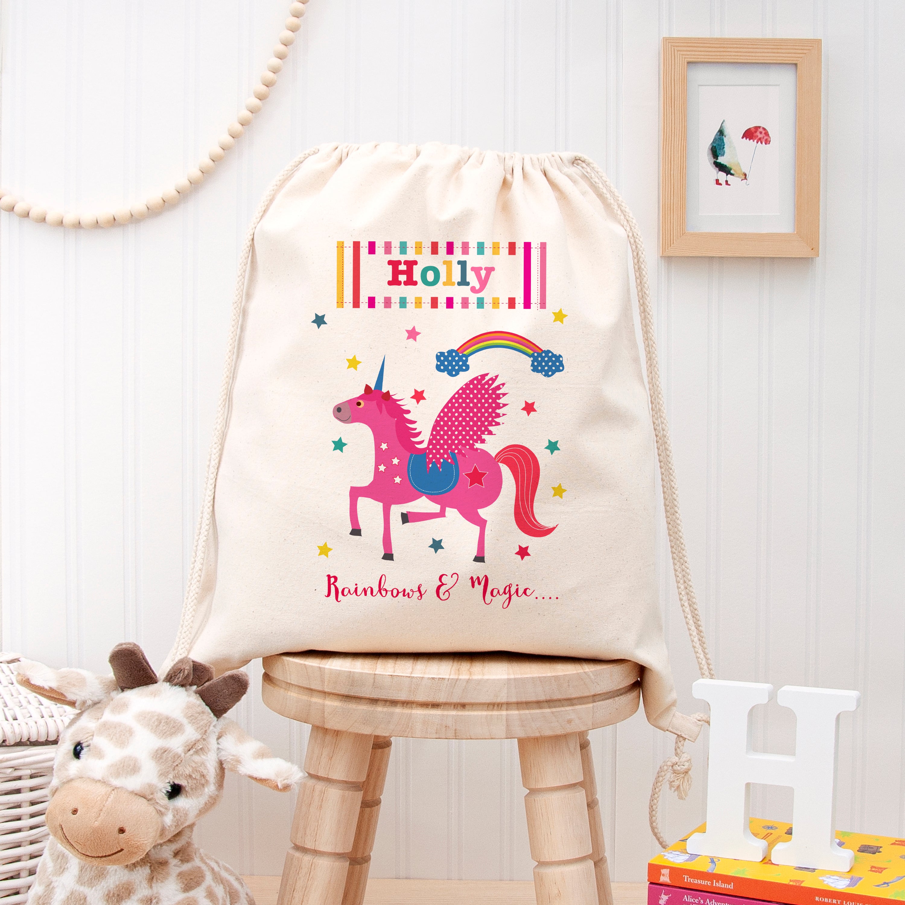 The personalisation adds to the magic for this bag, making each gift unique.It's like having their very own portal to a mystical land, personalised just for them by our team of artisan creatives! Unleash the magic and bring a smile to their face with this super cute unicorn nursery PE kit or book bag.