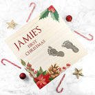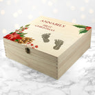 Their name will be written in red block capitals. A super cute image of baby feet will be placed prominently on their memento box, with gorgeous Christmassy plants and flowers in two corners, for something truly special to remember their first Christmas (and many more!) by.