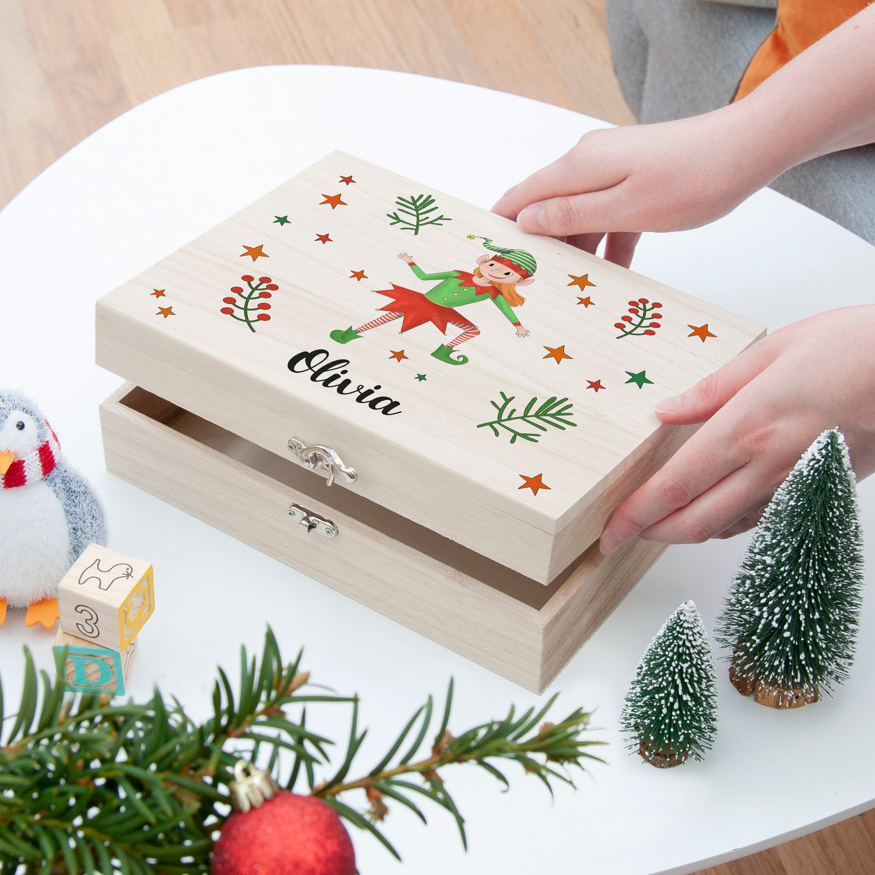 Spread holiday cheer this year with our fun and stylish Personalised Girl Elf Christmas Eve Box. It's the perfect way to get your loved ones into the festive spirit! This magical and delightful keepsake box is made of wood and features playing elves - how adorable is that! It’ll make a wonderful gift that your little one is sure to treasure forever.