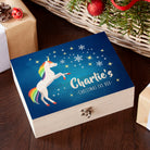 This gorgeous Christmas Eve Box features a stunning rainbow unicorn complete with magical sparkles and stars on a dark blue nights sky background. The words 'Christmas Eve Box' come as standard text in white, contrasting beautifully with the darker background. Please be sure to add the name exactly as you would like it printed for example if the name is Thomas please write Thomas'