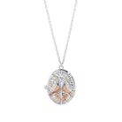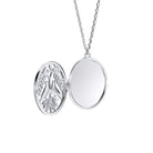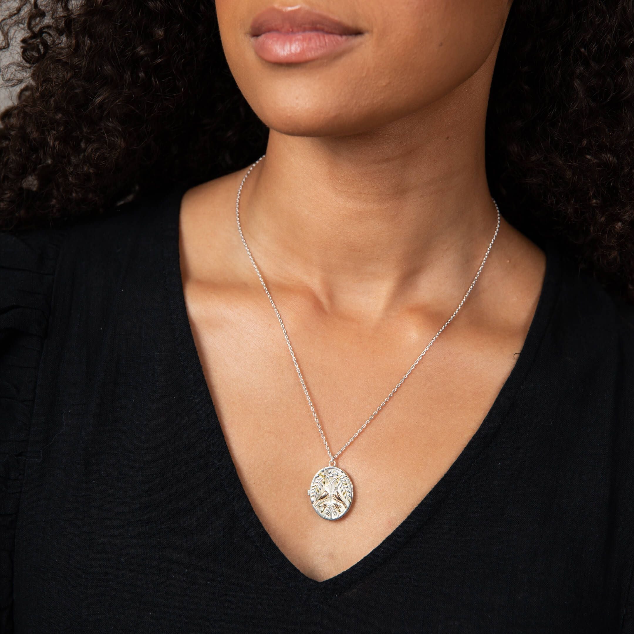 The oval-shaped openable locket is adorned with an intricate cut-out design that frames two turtle doves gracefully facing one another, their delicate forms symbolising love, devotion, and harmony. The birds are finished with subtle rose gold accents, which lend a soft warmth to the design, while touches of yellow gold highlight the surrounding foliage, creating a harmonious contrast against the cool, polished silver backdrop. The intricate detailing of the leaves and branches, combined with the refined craftsmanship of the doves, ensures that every angle of this piece captures both light and attention, offering an exquisite balance of artistry and sentiment.