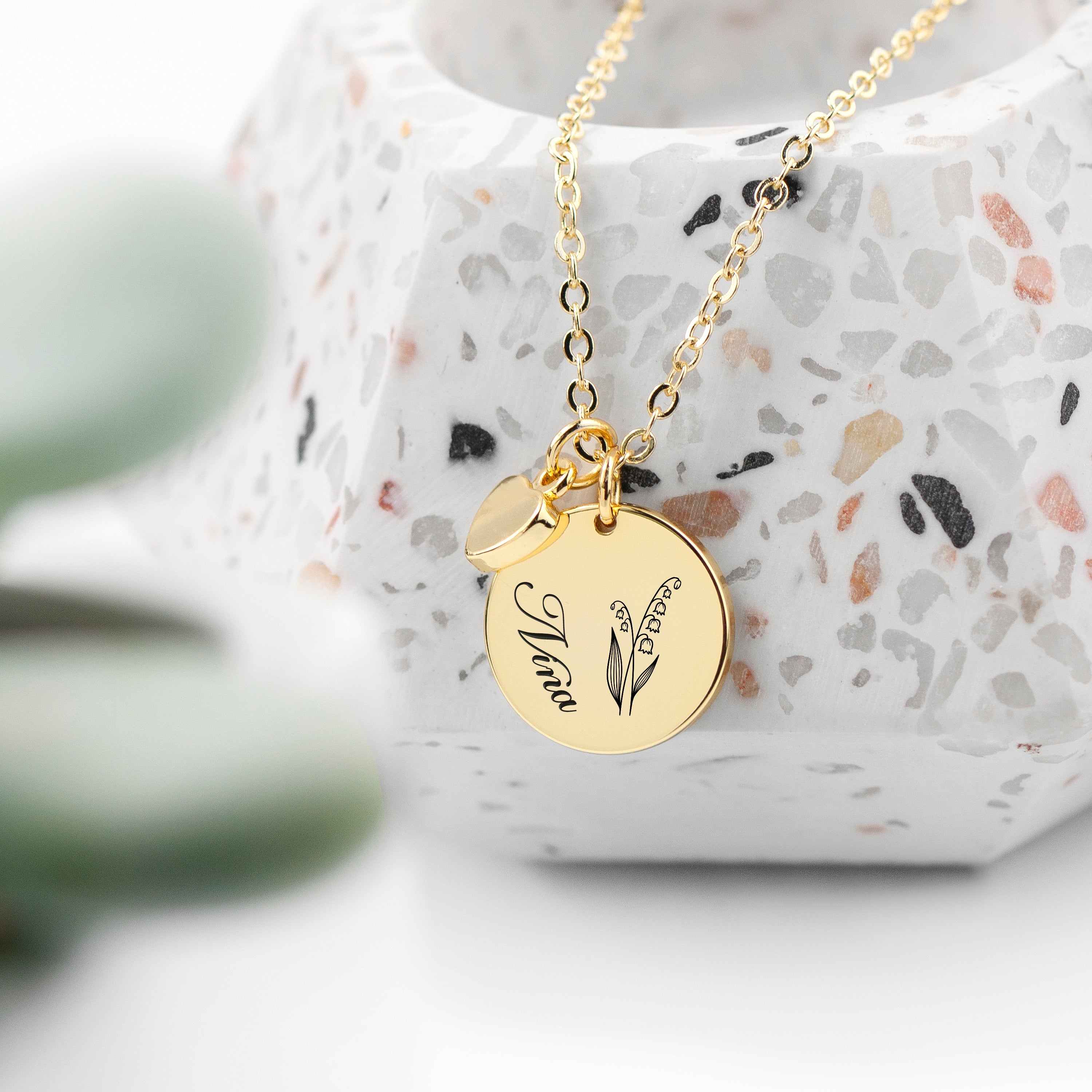 What makes this necklace truly special is the meticulously engraved birth month flower illustration. Choose your birth month flower from the dropdown list: