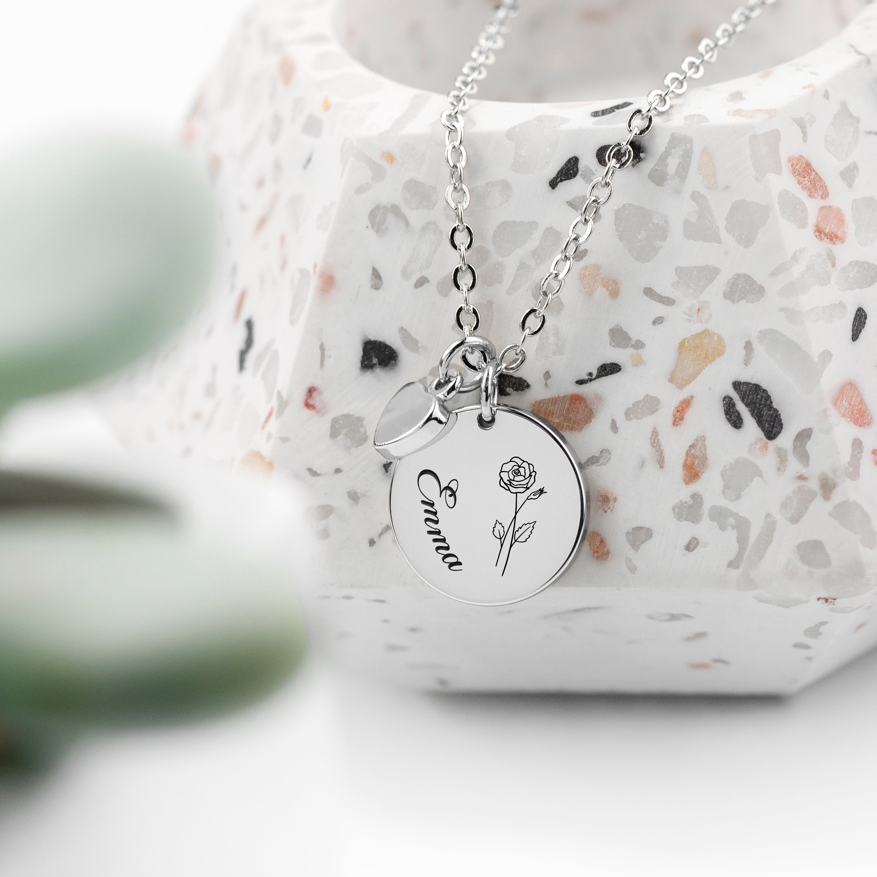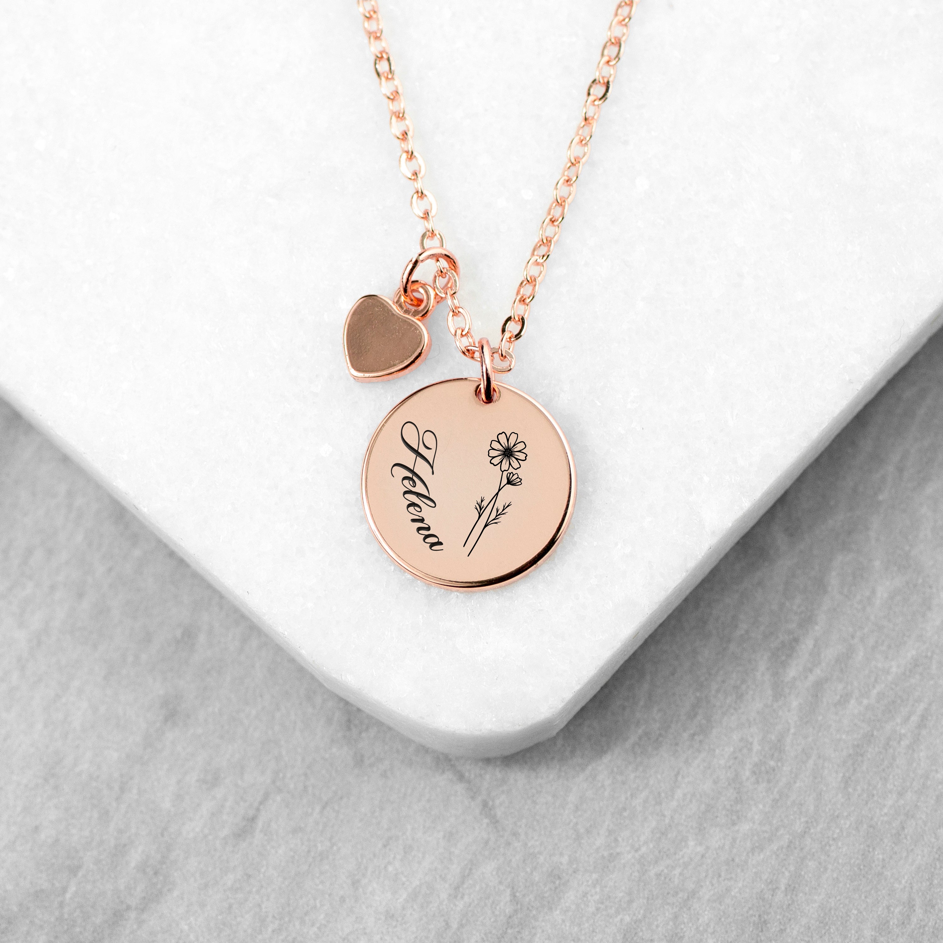 Give that special woman in your life a meaningful gift with our beautiful Personalised Birth Flower Heart and Disc Necklace. With its unique design, this necklace is perfect for any occasion, making it an ideal birthday present or thoughtful Mother’s Day gift. This stunning piece of premium quality women's jewellery will be cherished for years to come.