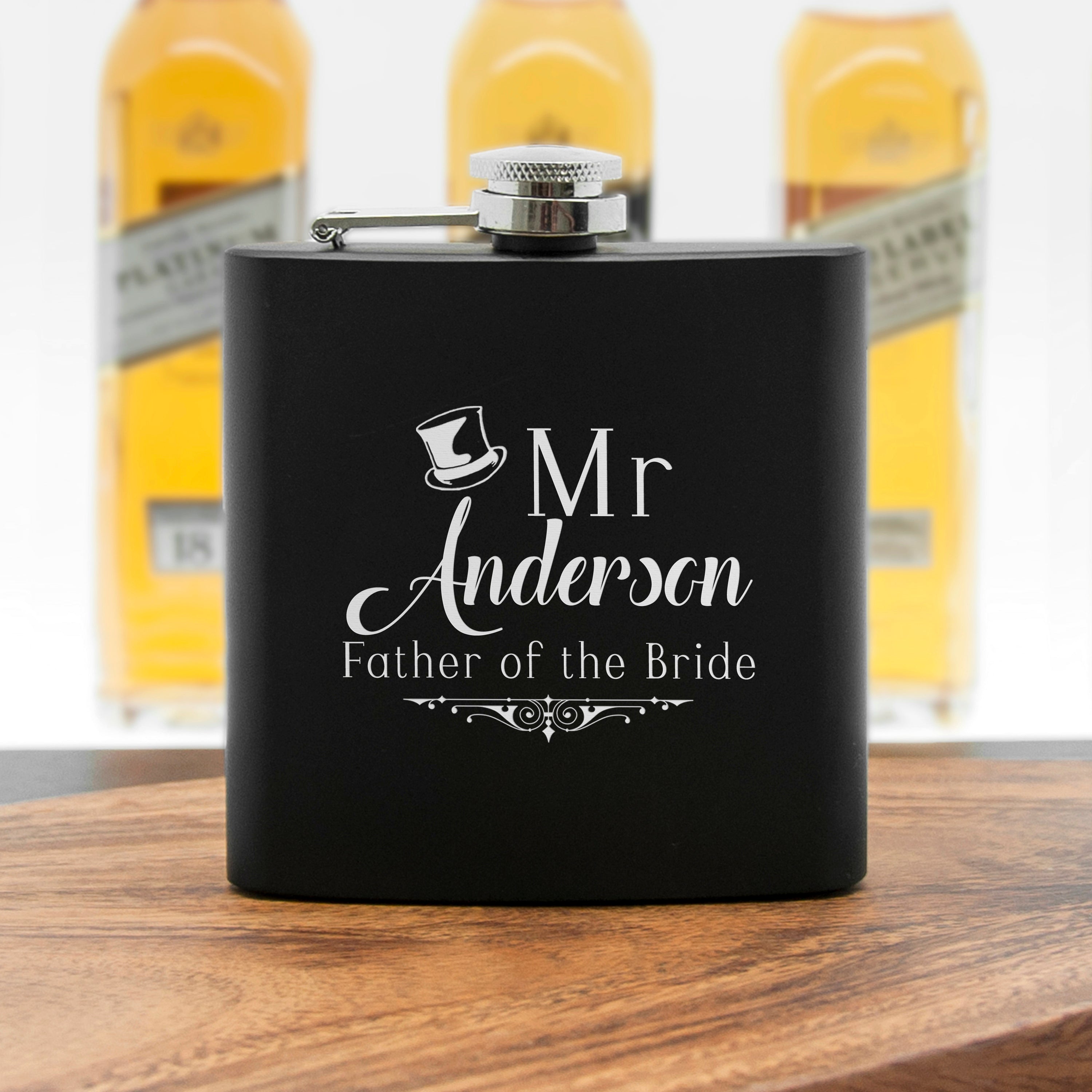 This black matte stainless steel hip flask is designed in a fabulous top hat design and personalised with a surname of your choice.