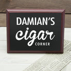 ‘[Name]’s Cigar Corner’ comes as standard text in a striking white colour, which contrasts beautifully to the black background and walnut coloured wooden surround.