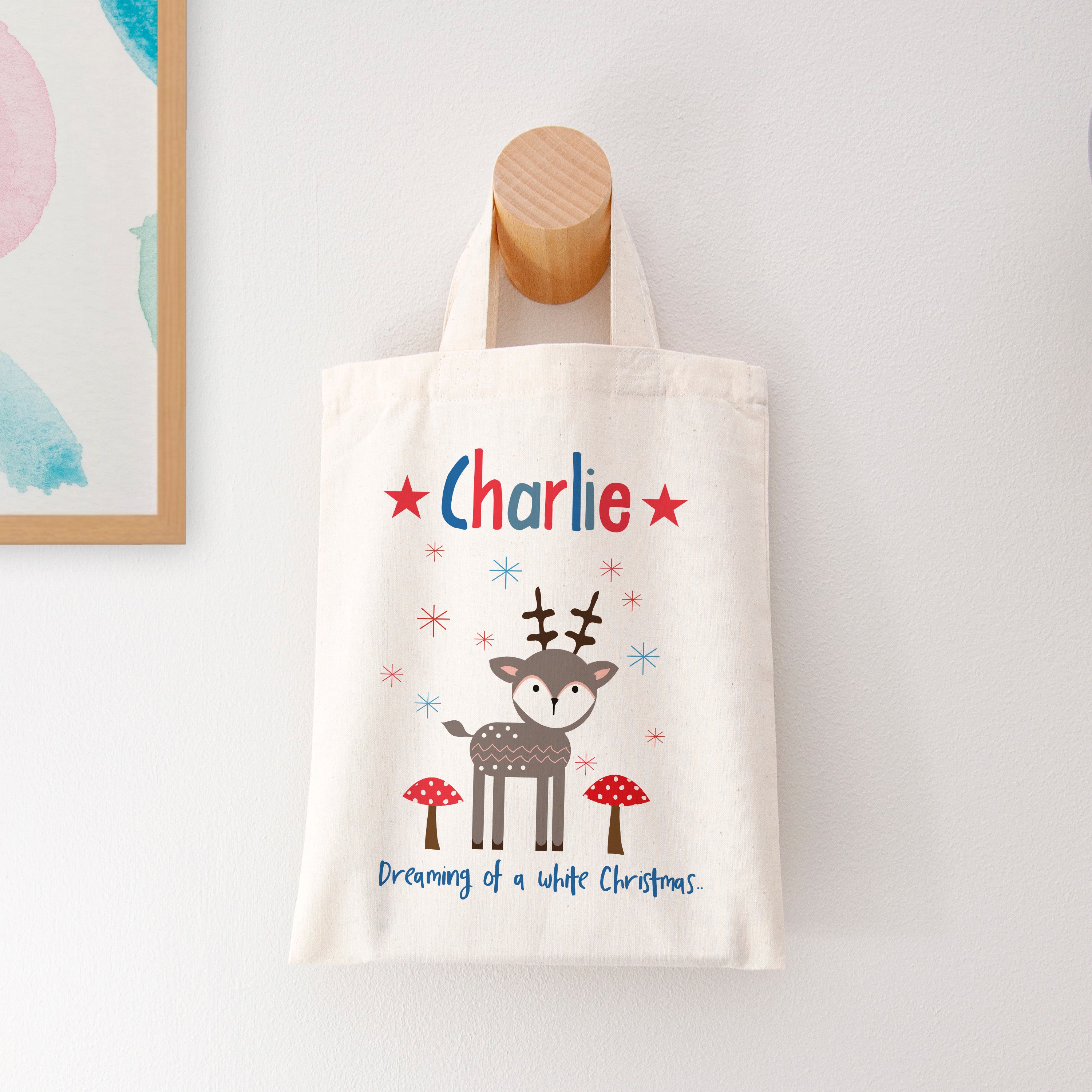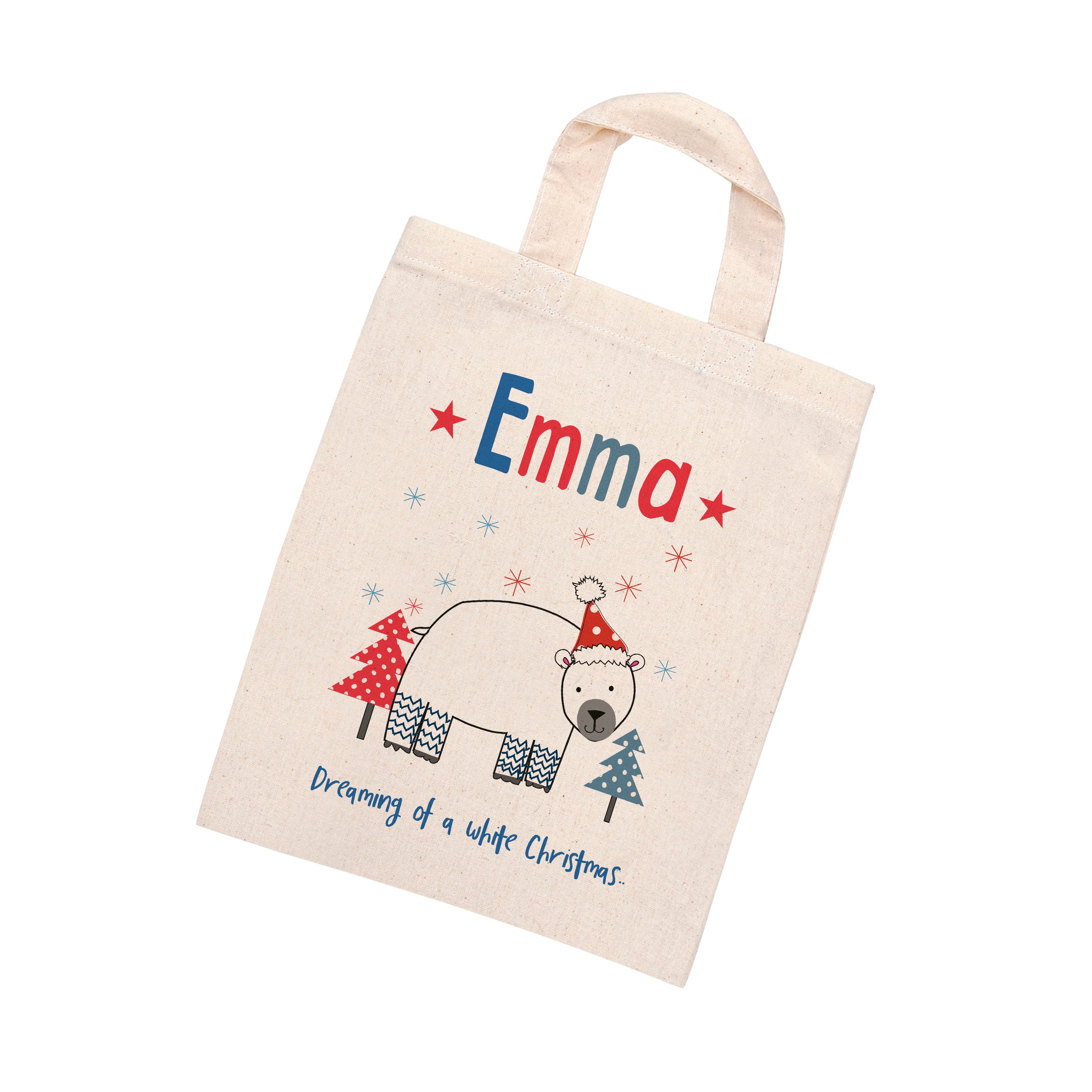‘Dreaming of a white Christmas’ comes as standard text with this beautiful mini tote bag design.