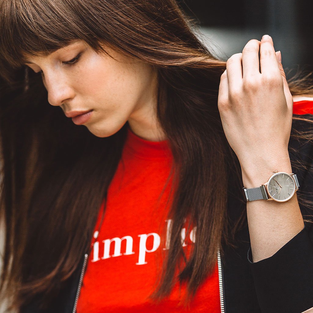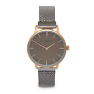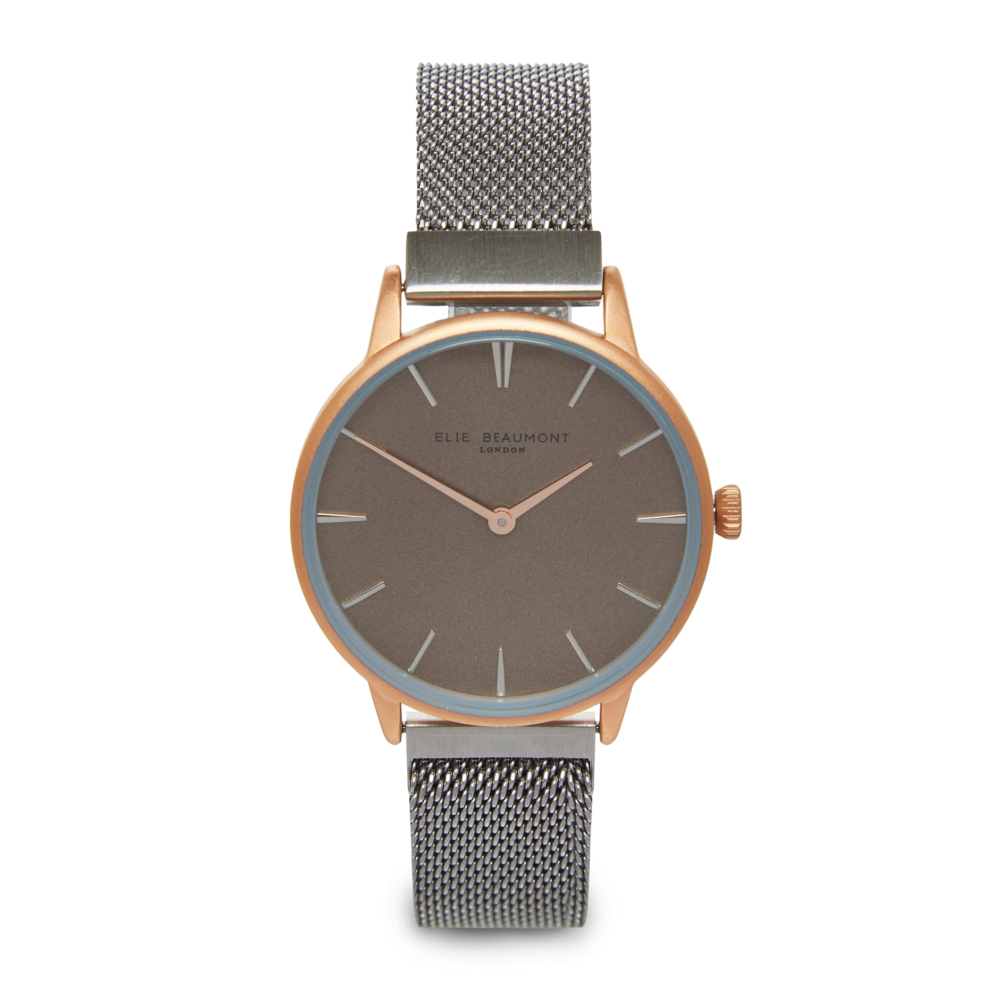 The gorgeous Elie Beaumont Holborn dial with mesh bracelets, a contemporary twist on a classic tale. With a gorgeous mesh strap in gun metal and a classic large 33mm rose gold dial with a stunning metallic finish this watch certainly makes a statement.