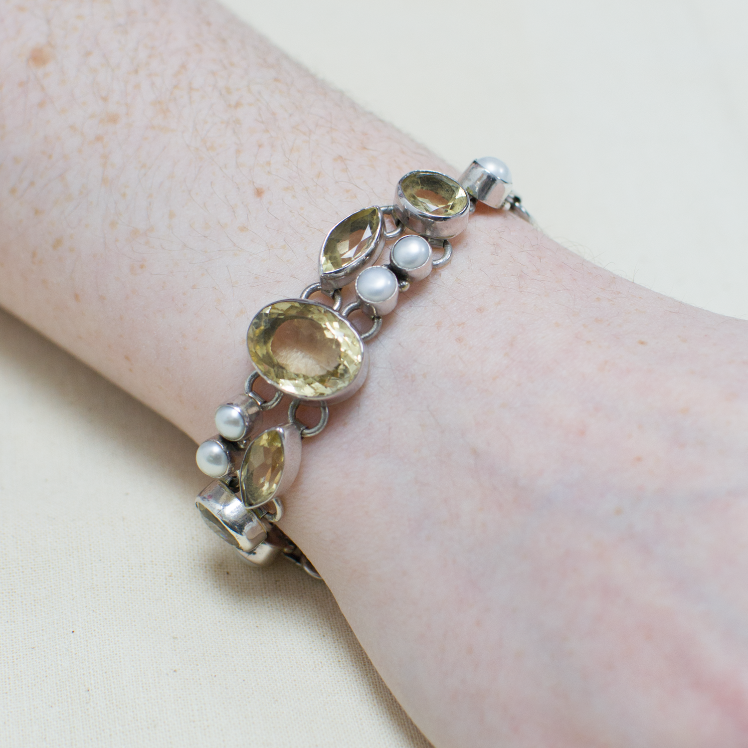 At the heart of the design lies a substantial, faceted oval citrine, flanked by a symmetrical display of marquise-cut citrines, petite round-cut citrines, and delicate white pearls. These gemstone stations are joined by polished silver link rings, leading to a robust chain that ensures both durability and fluid movement on the wrist. The silver framework provides a crisp, structural border that enhances the warm, brilliance of the stones, resulting in a versatile accessory that transitions seamlessly from understated daytime elegance to radiant evening glamour.