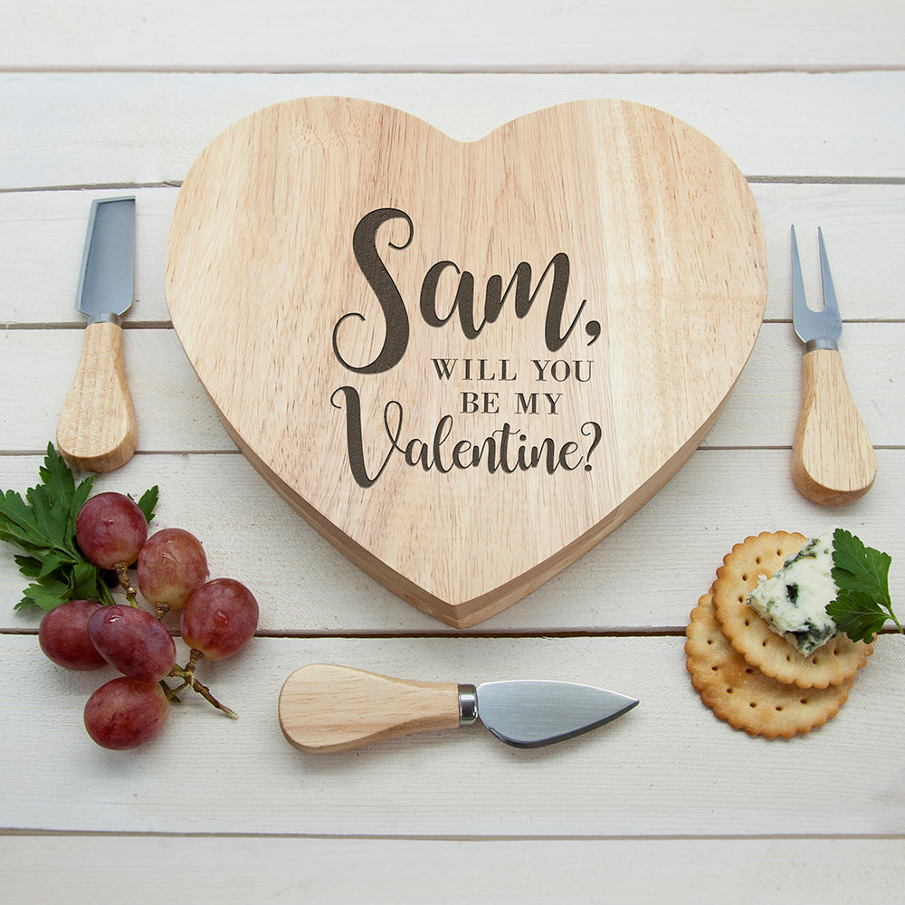 Heart shaped cheese board with integrated speciality knife compartment made from sustainable Hevea wood.
