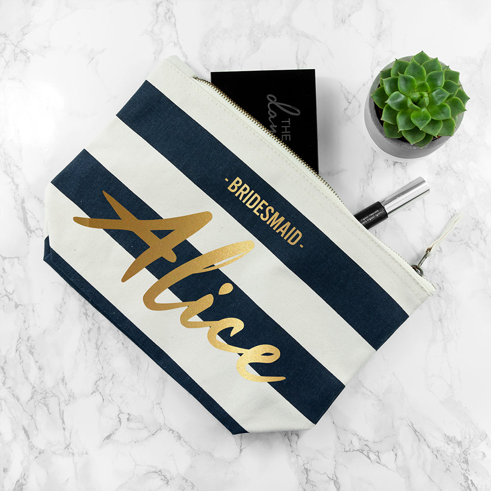 Personalised Striped Navy and Gold Bridesmaid Cosmetics Bag