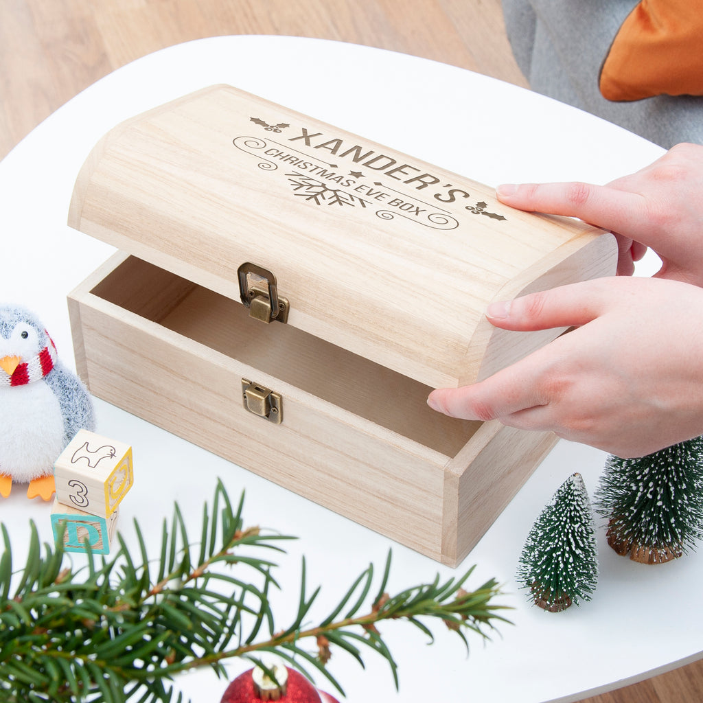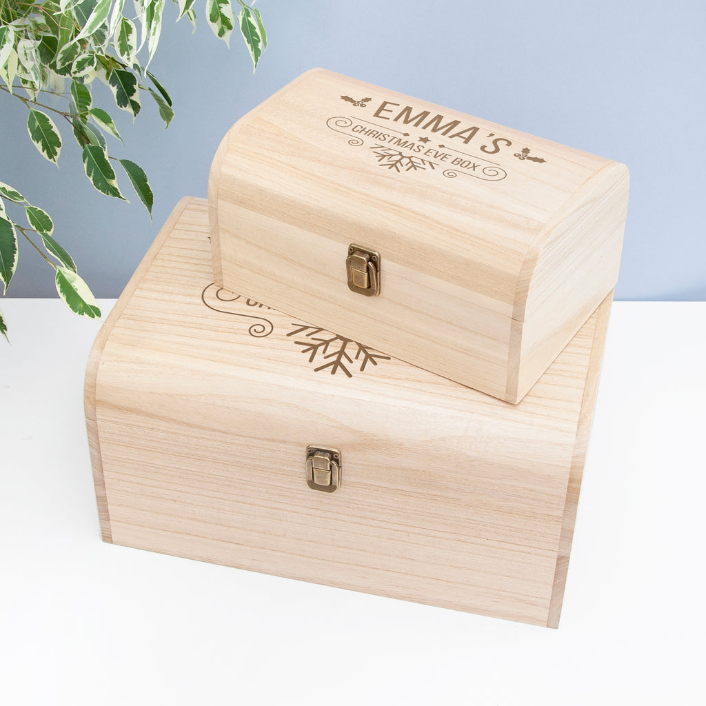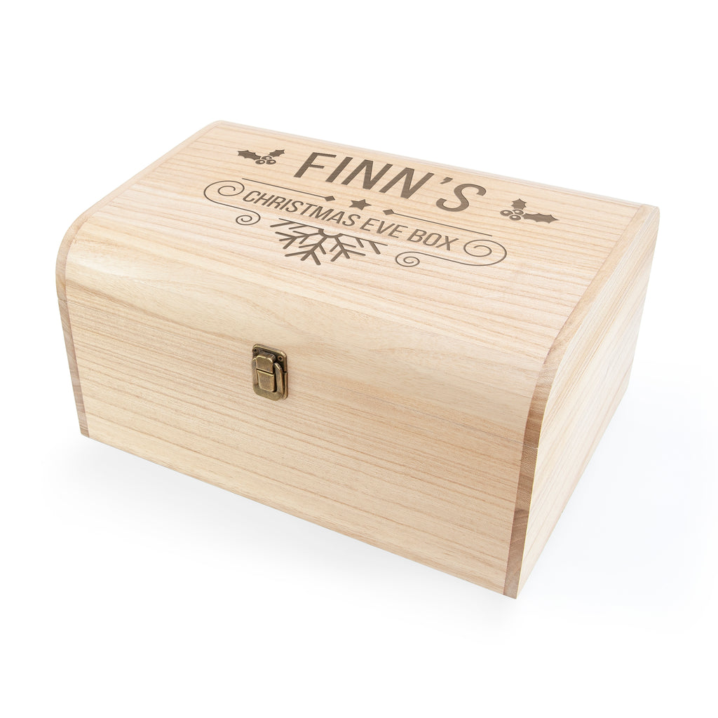 The words 'Christmas Eve Box' come as standard text. Please be sure to add the name exactly as you would like it engraved for example if the name is Thomas please write Thomas'