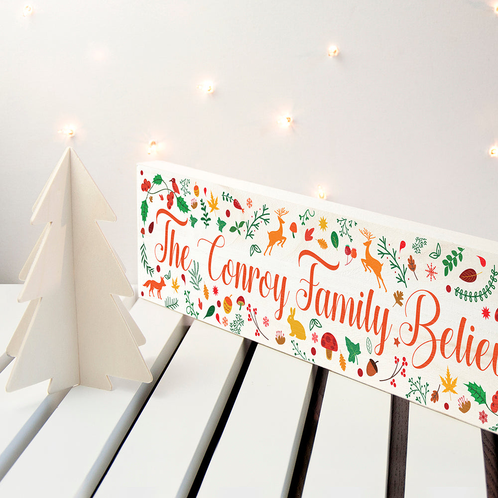 The decorative sign is the perfect accessory for your mantelpiece hallway or shelves. The woodland scene is complete with prancing reindeers acorn adorable foxes and autumnal colours. In the centre in bold orange script style letters comes the festive standard text 'The [Surname] Family Believe'.