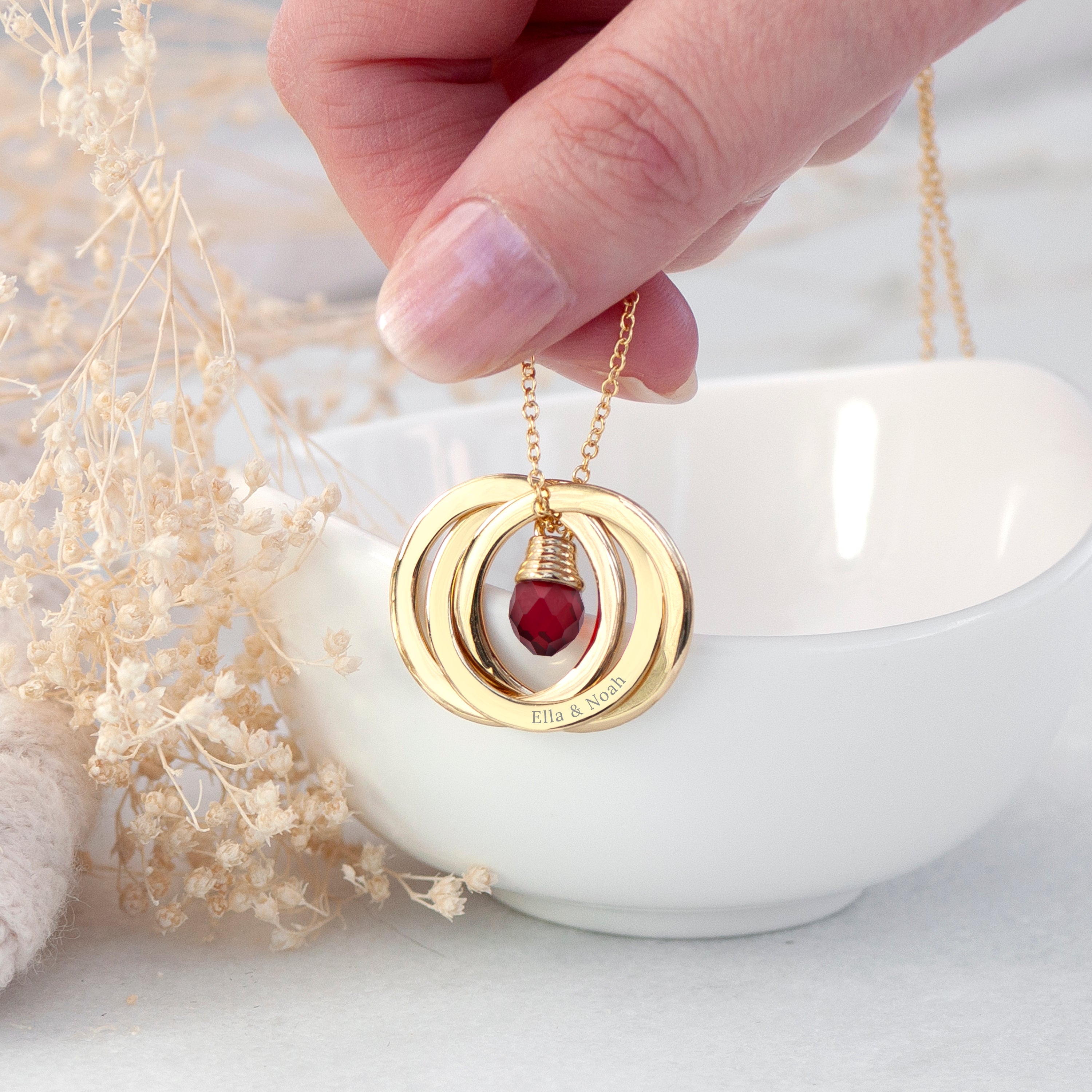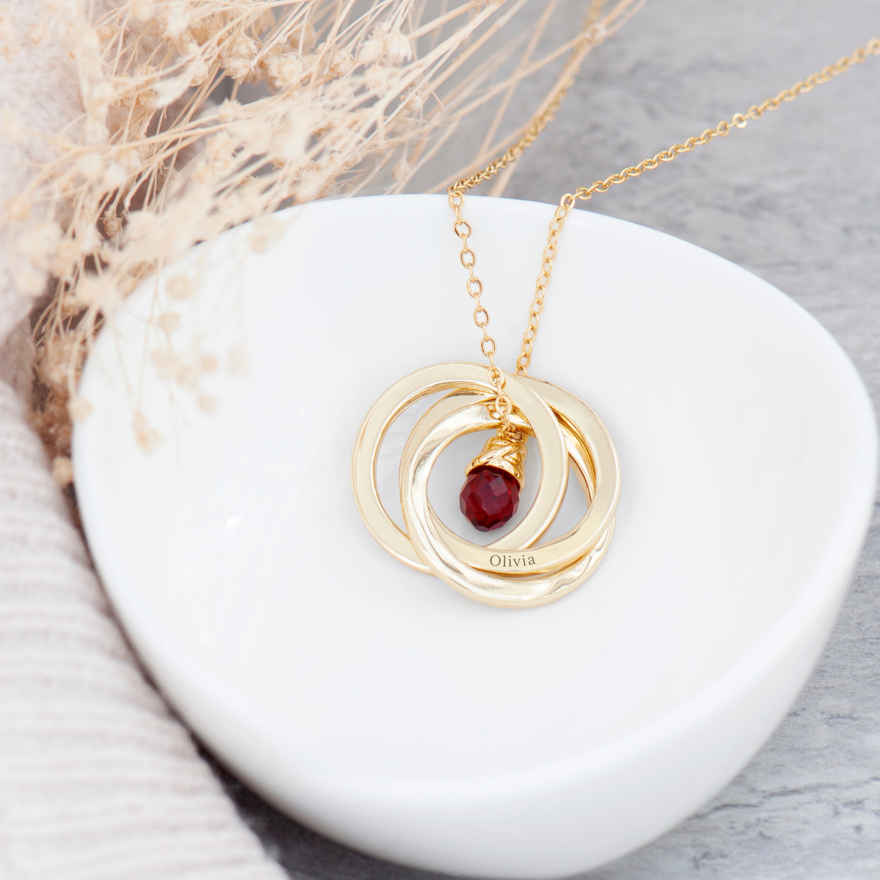 A Russian Ring symbolises friendships or familial bonds and pays homage to the past, present, and future. This makes our stunning Personalised Russian Ring Garnet Crystal Necklace the perfect gift for a friend, partner or mum to show them how much they mean to you.