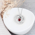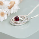 The ultimate Valentine’s, Mother’s Day or birthday gift for her, this premium quality necklace will perfectly compliment any outfit she wears it with. A fabulous addition to her jewellery collection that she’s sure to treasure. Three interlocking rings encircle a beautiful red garnet crystal, which will add a touch of colour and glamour to her ensemble.