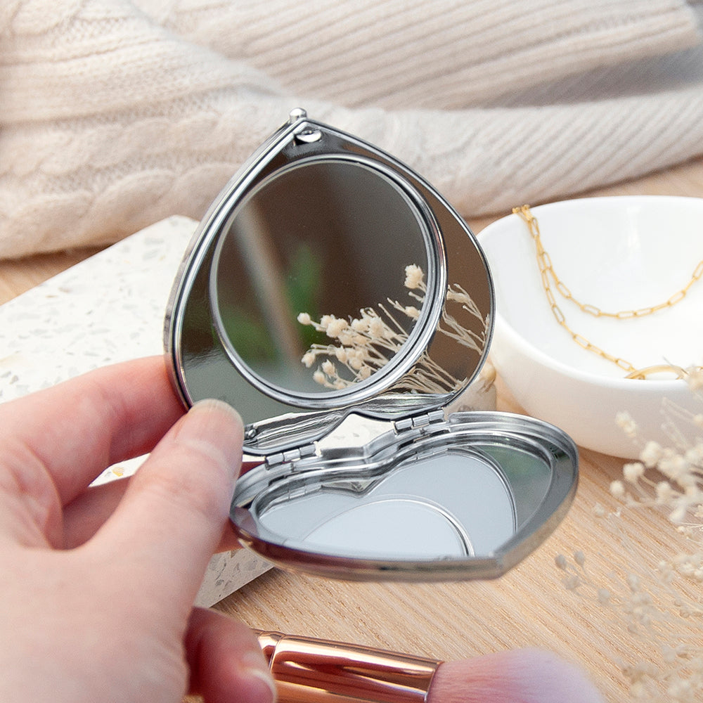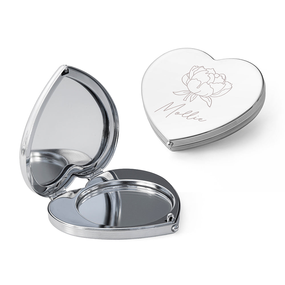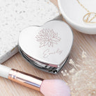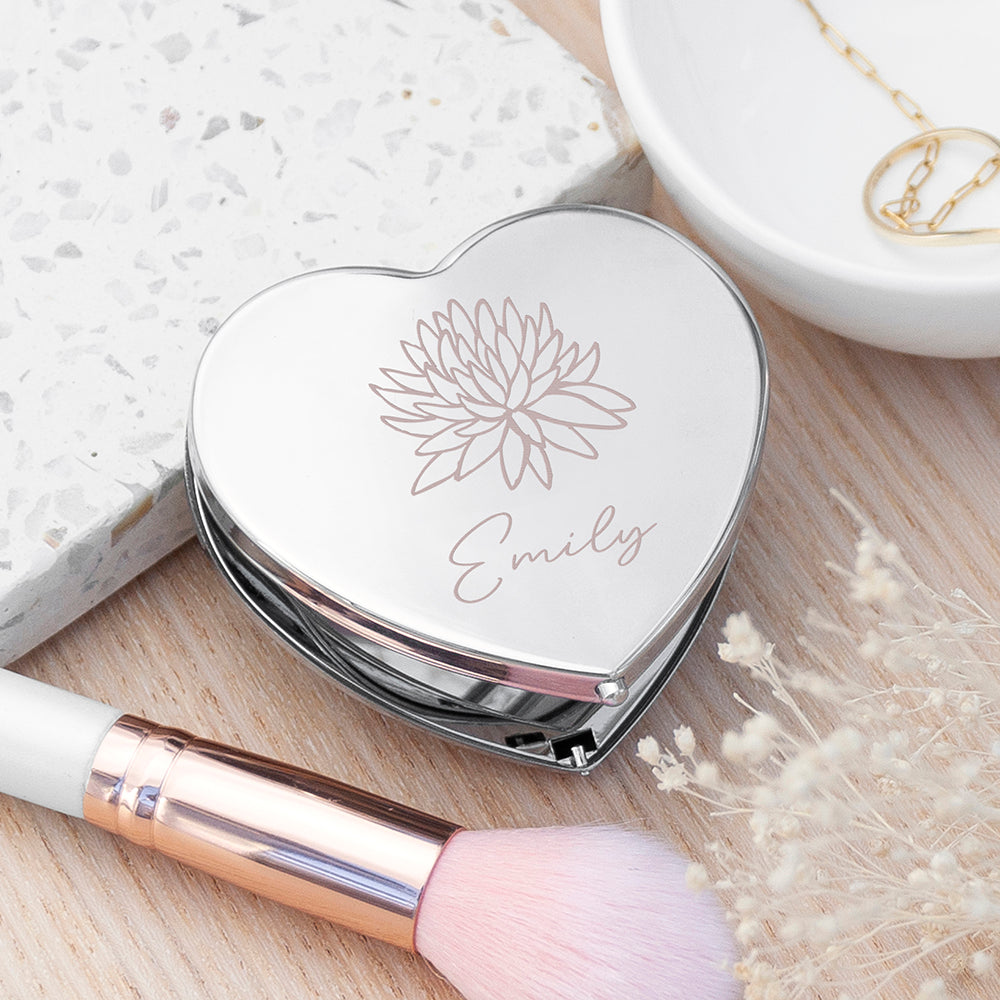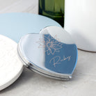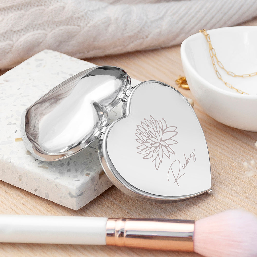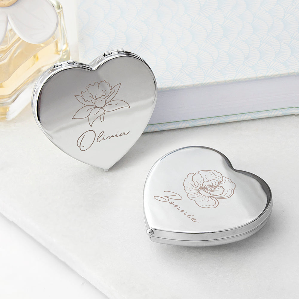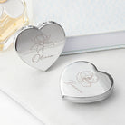 Our fabulous personalised silver heart birth flower compact mirror is more than just a stylish accessory, it's a celebration of individuality. The silver heart exterior beautifully showcases her birth flower, a unique touch that encapsulates her essence in a timeless keepsake.