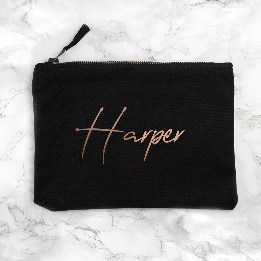 Our beautiful black zip up makeup bag will feature your loved one's name in a large script-style font to prominently show it's theirs. To make it pop even more on the black background, their name will be written in a stunning rose gold that's guaranteed to wow.
