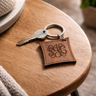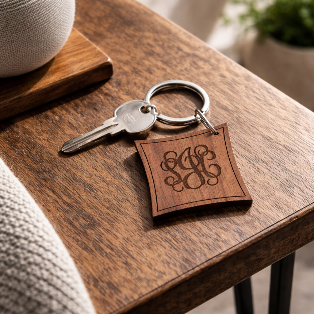 The design features a softly curved rectangular silhouette, lending this wooden keychain a timeless appeal. Encasing the central engraving is a delicately etched border that follows the contour of the piece, framing the monogram with a sense of balance and sophistication. At the heart of the design lies the intricately engraved set of initials, rendered in an ornate script that intertwines gracefully. The lettering is both decorative and legible, evoking a sense of heritage craftsmanship. The precision of the engraving creates a subtle contrast against the walnut background, allowing the initials to stand out with refined clarity.