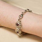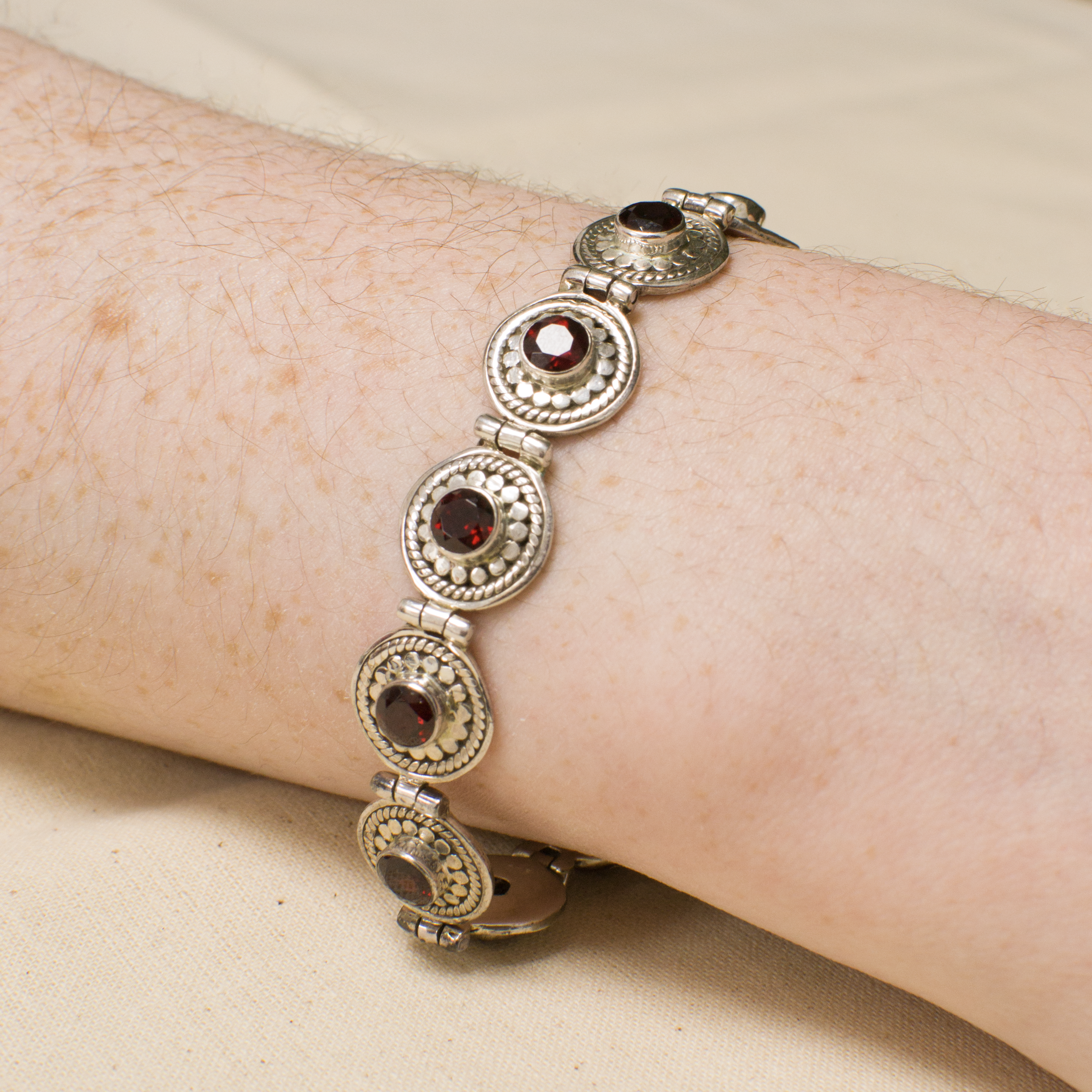 This premium quality piece of jewellery presents a continuous line of evenly spaced silver coin motifs, linked together with smooth, unobtrusive connectors that ensure fluid movement around the wrist and a comfortable, secure fit. The silver has a softly lustrous finish that enhances the intricate detailing surrounding each gemstone, lending the piece a vintage-inspired yet contemporary aesthetic.