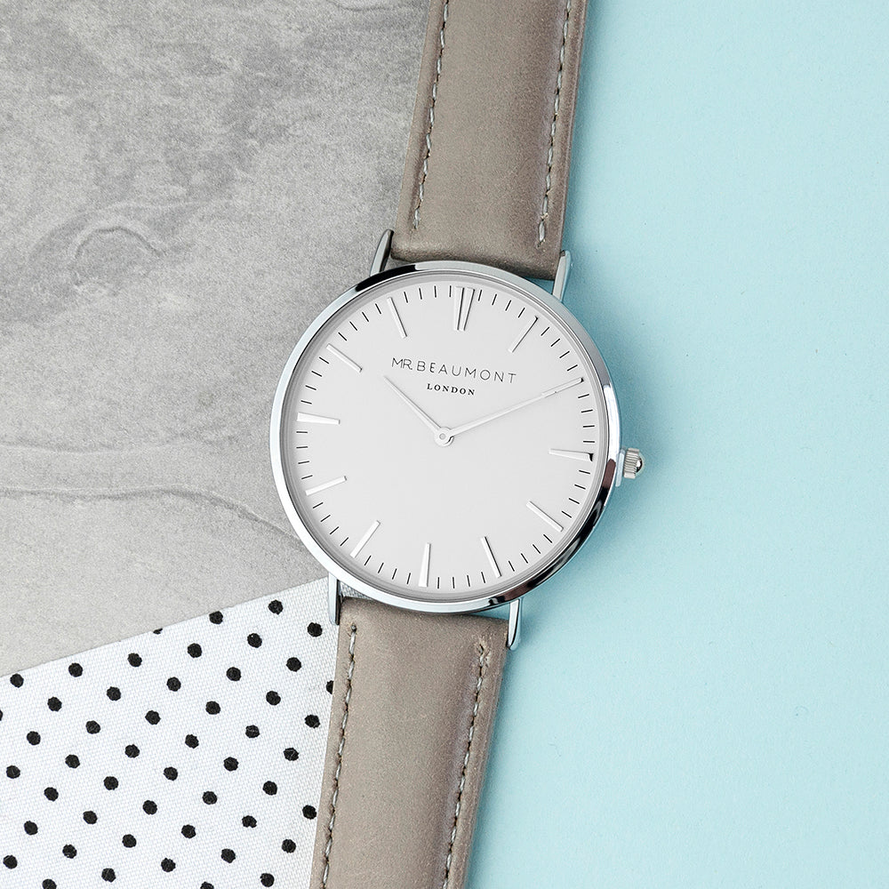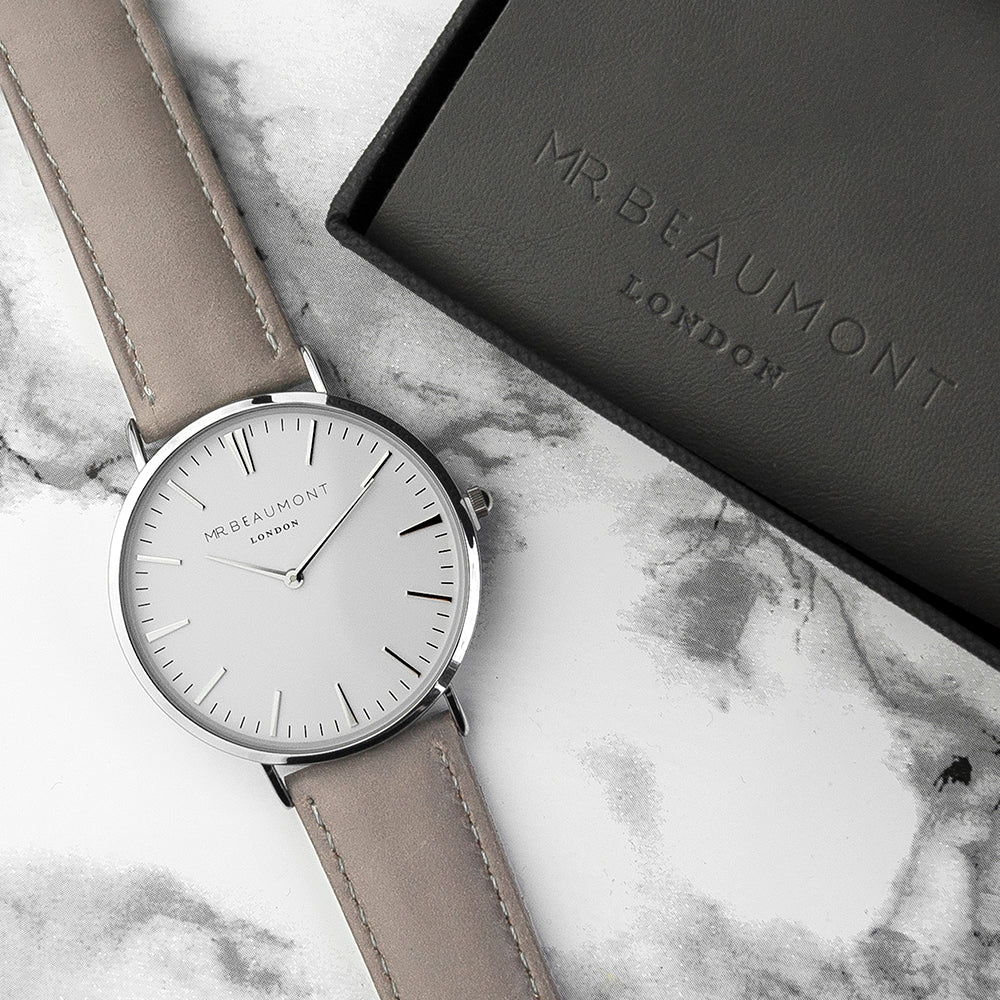 Mr Beaumont watches are modern in design but with classic, timeless touches - making them a gift that will stand the test of time. Made from genuine leather and with a large 41mm dial with metallic silver details this watch certainly makes a statement.