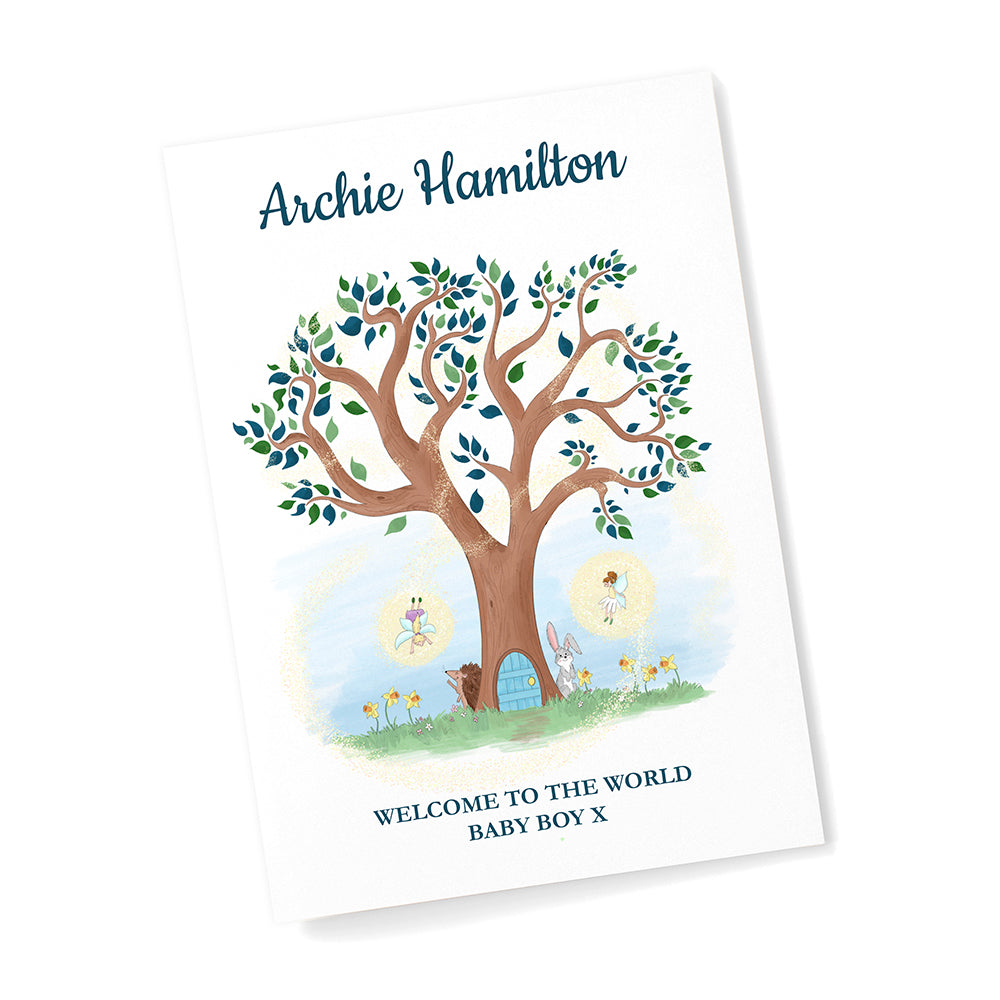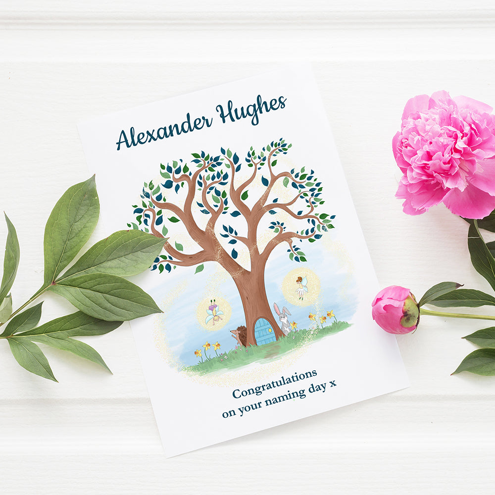 Set on a beautiful spring day with animals out and daffodils in full bloom, this gorgeous wall art depicts an Alice in Wonderland style tree, which is home to fairies. Their name appears at the top of the image in a blue script font, whilst the message will be placed below the tree in the same colour as standard.