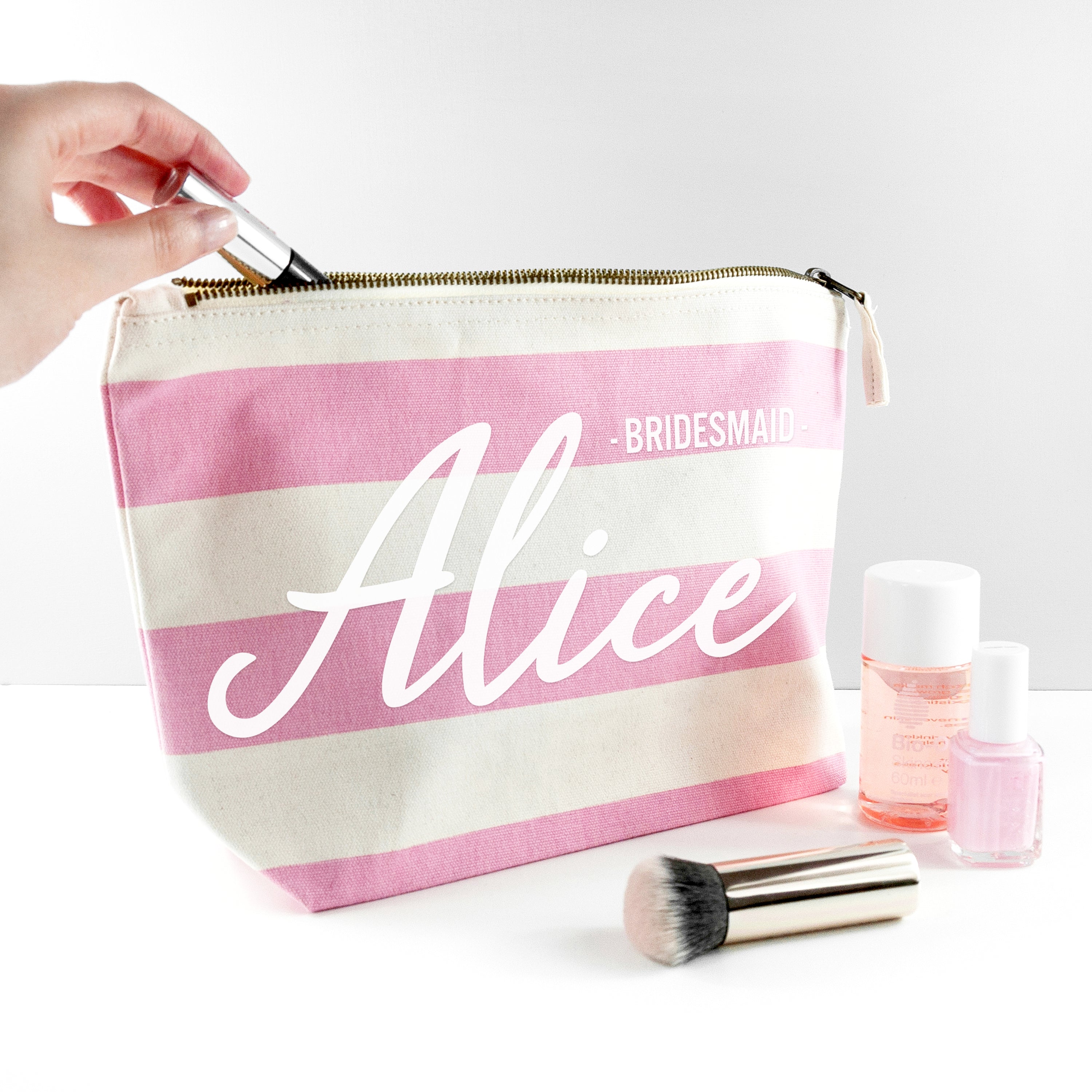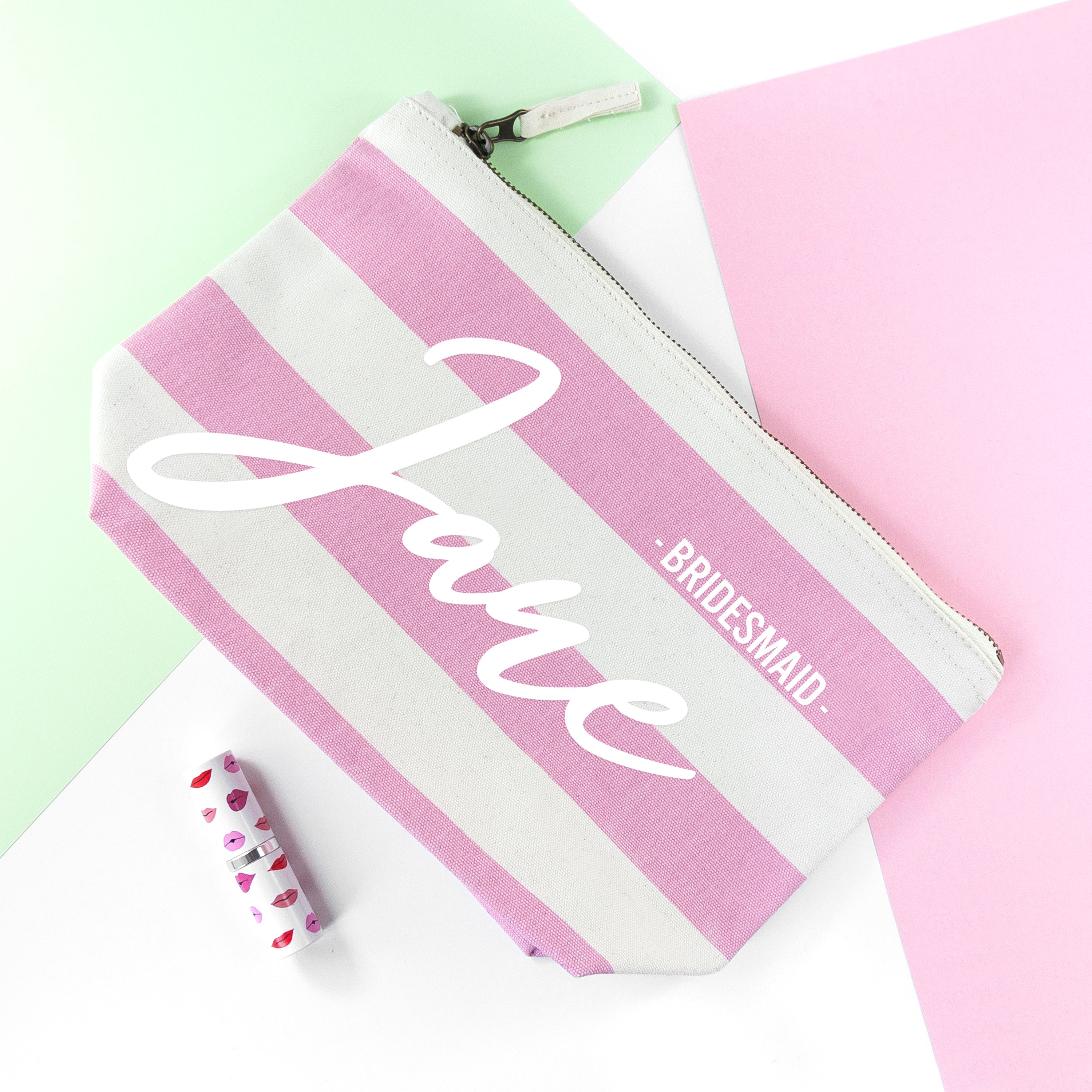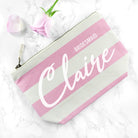Say thank you for all of their help on your big day with our personalised bridesmaid cosmetic bag. A beautiful, customised gift is the perfect way to show your gratitude, and this striped canvas makeup bag is sure to be loved by all of your bride tribe!