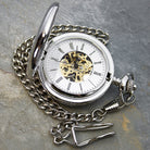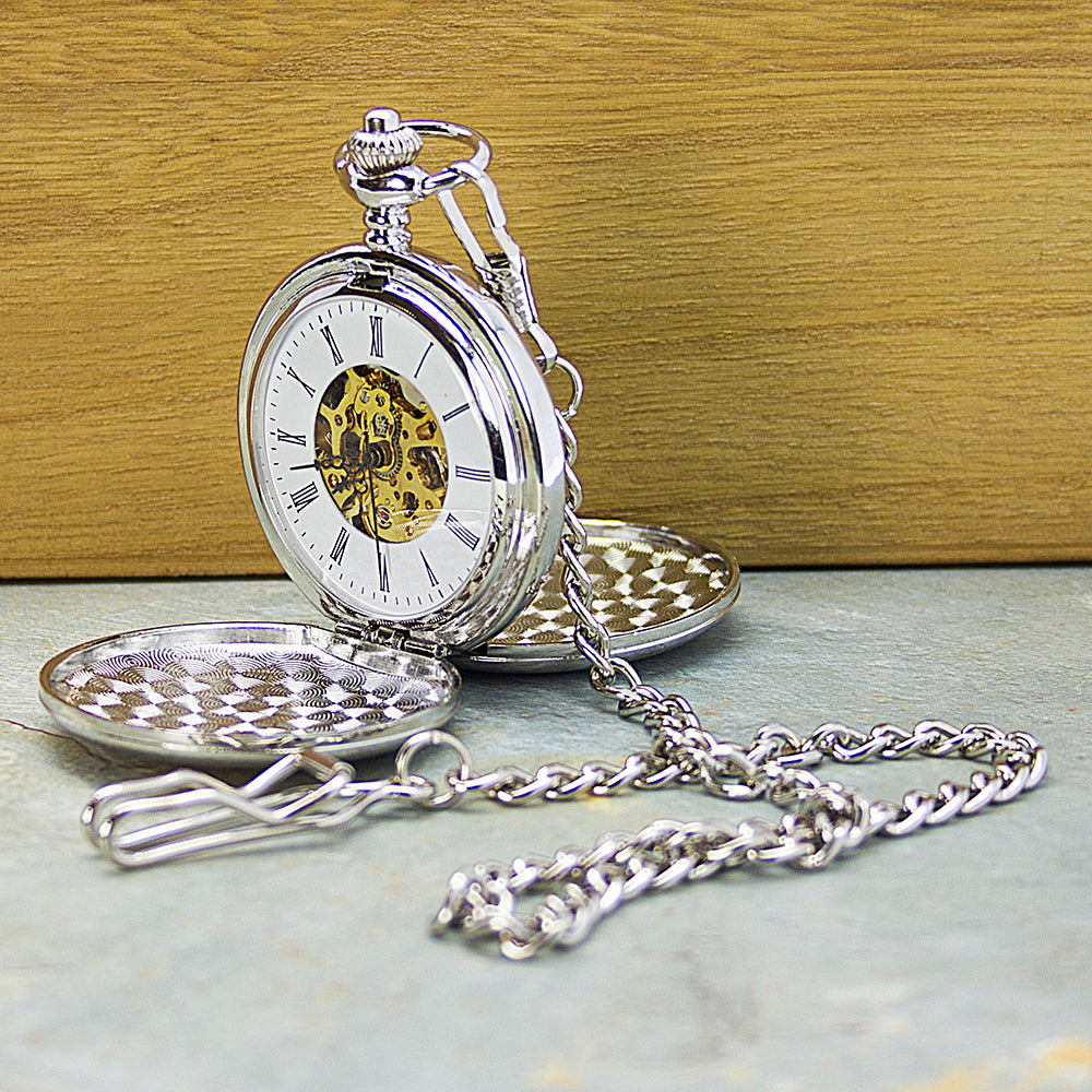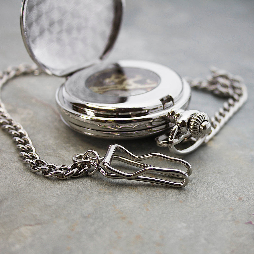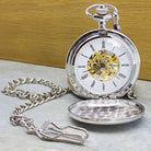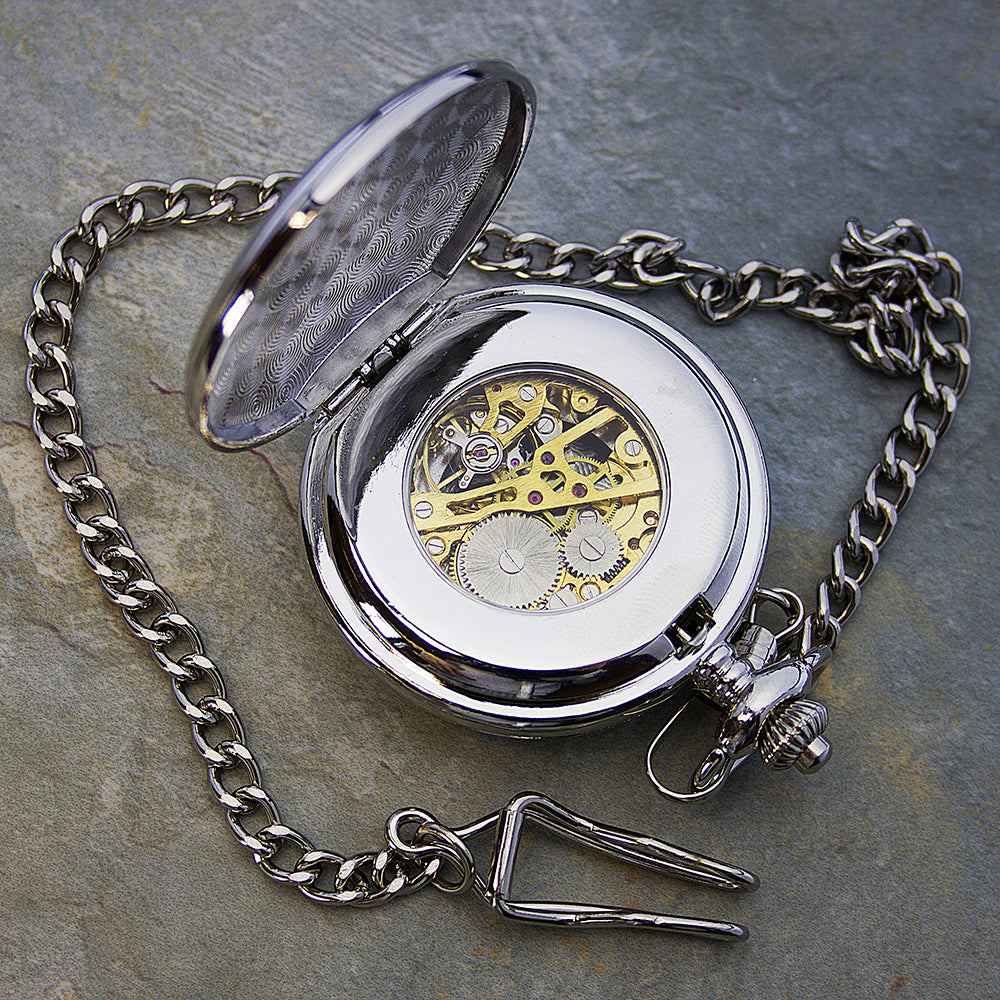 Stylish engraved mechanical pocket watch with golden cut out displaying the mechanism working inside, this truly mesmerising pocket watch is a fantastic gift for Valentine's Day.