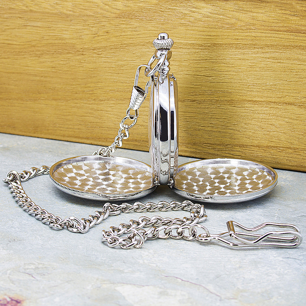 The watch is silver plated and comes with a long chain and pocket clip measuring 37cm in length. Being double sided the watch can be stood up when both sides are open adding to this watch's enchanting design.