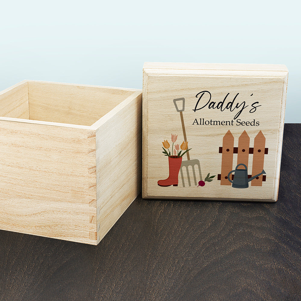 Centrally positioned above the illustration is the personalised text, which reads ‘[Name]’s Allotment Seeds’ in a stylish combination of fonts - a sweeping, handwritten-style script for the name, followed by a classic serif type for the wording beneath. The text is cleanly printed and easy to read, adding a bespoke element that transforms the box from a simple item of storage into a deeply personal gift. Whomever the recipient, it is sure to bring a smile to their face every time they reach for their gardening essentials. It’s a thoughtful keepsake that they’ll treasure for seasons to come.