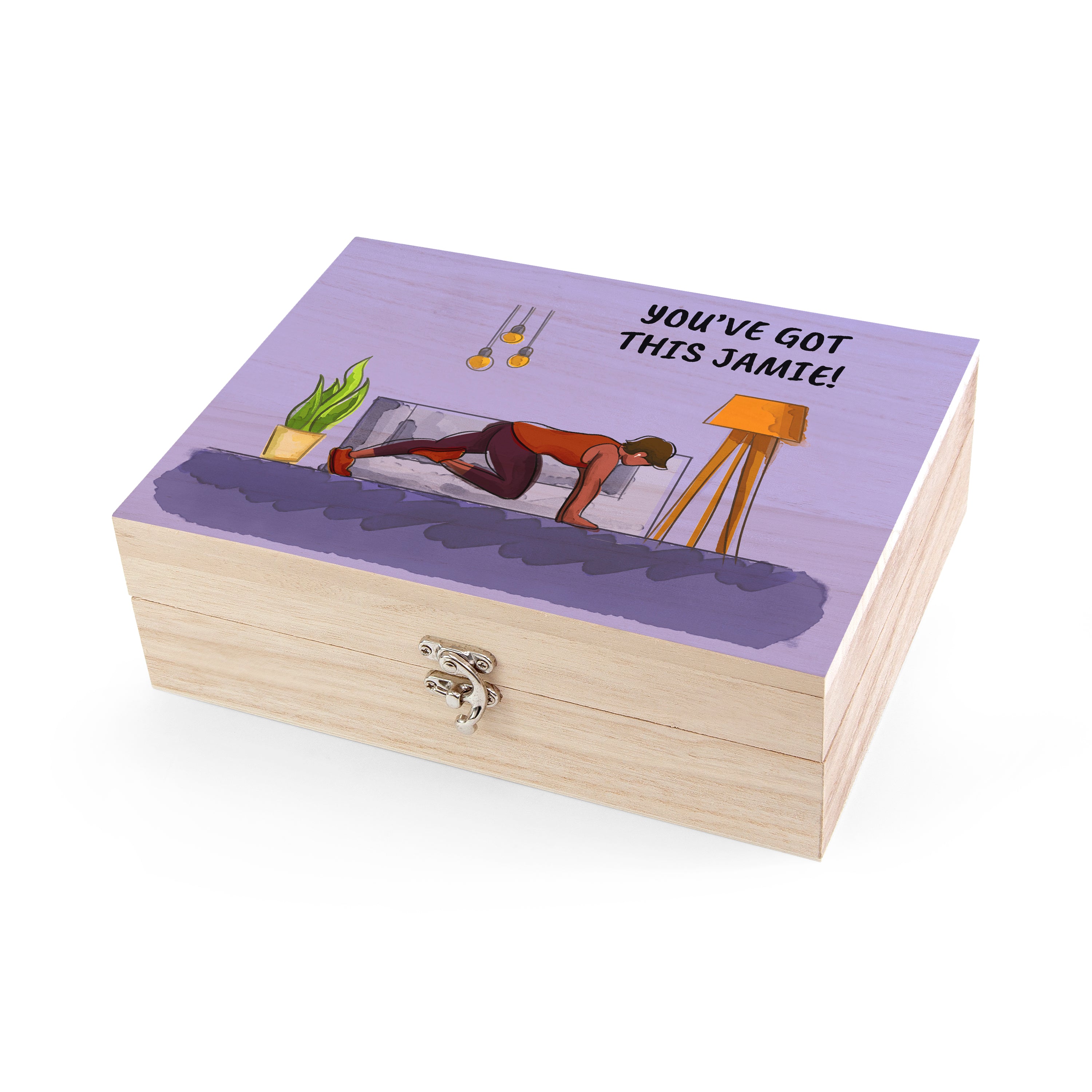 This stunning snack box design incorporates a pastel blue themed living room setting with a male character exercising, fully focused with his earphones in. The personalisation appears prominently in black capital letters in the top right corner of the image.