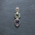 At the top of the pendant sits a delicately proportioned oval amethyst gemstone, softly faceted and bezel-set within a sleek silver frame. Below this, a larger round green topaz forms the focal point of the design, its pale green hue catching the light with crisp brilliance and subtle depth. Completing the composition is a striking teardrop-shaped amethyst gemstone, faceted to reflect light from multiple angles and adding gentle movement and visual richness to the pendant.