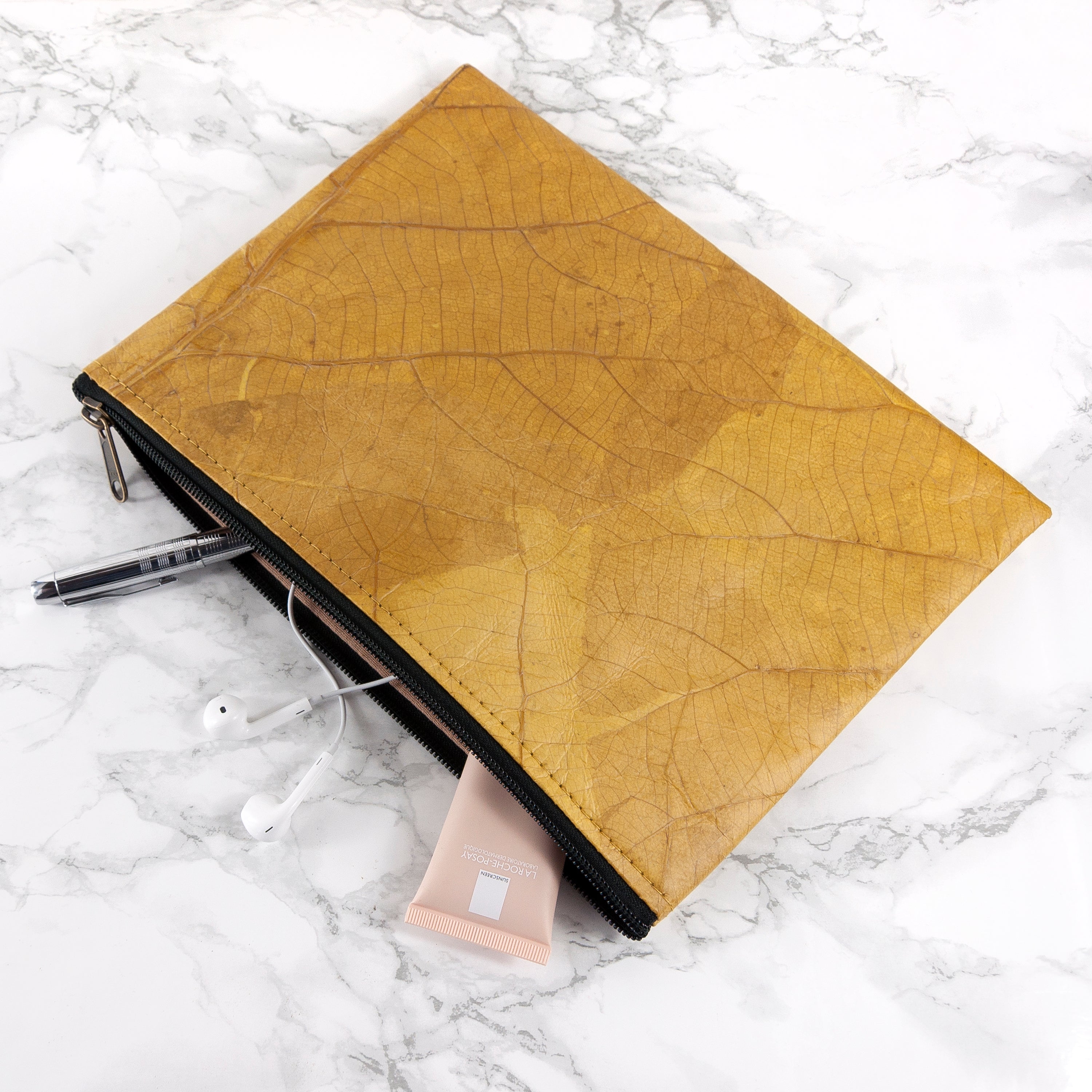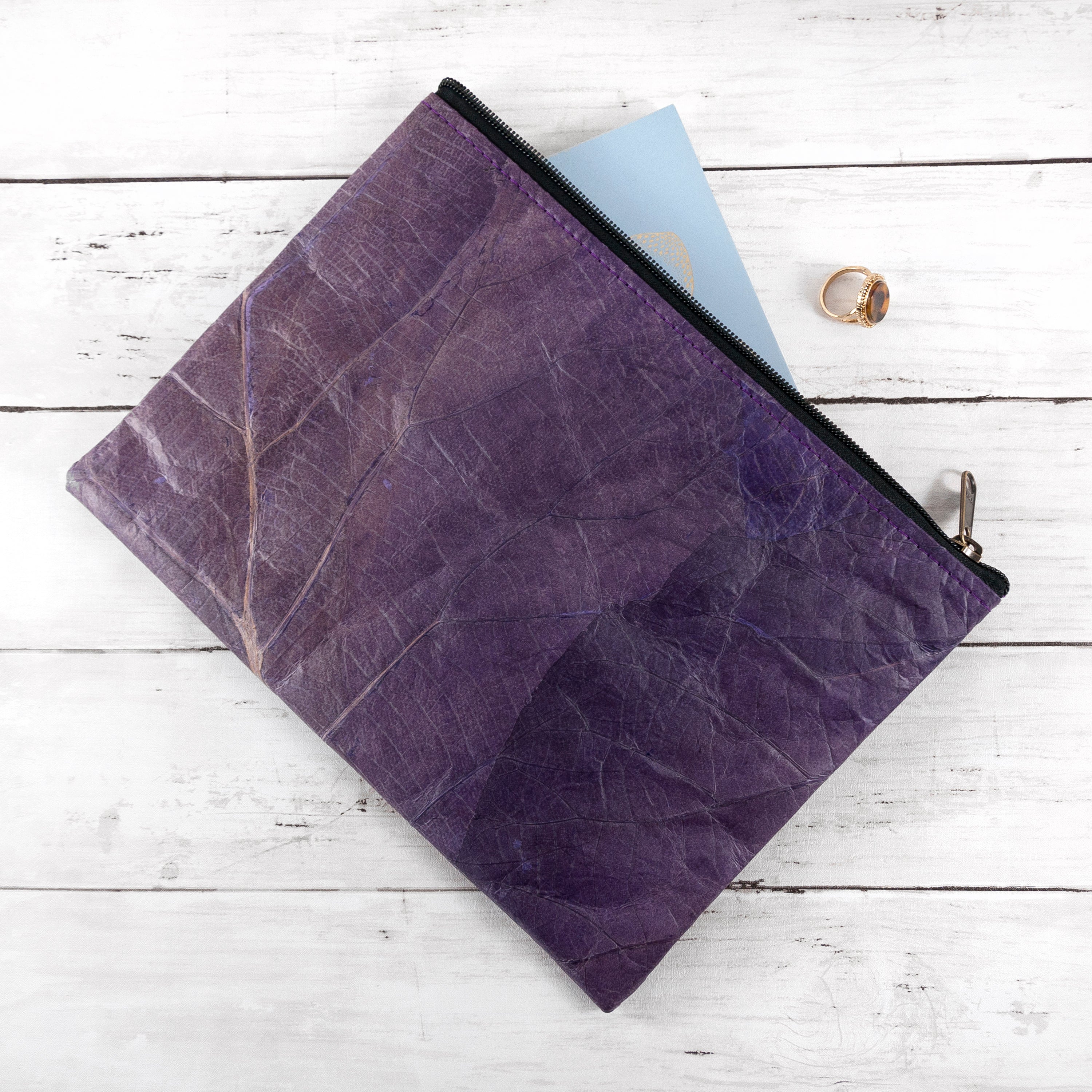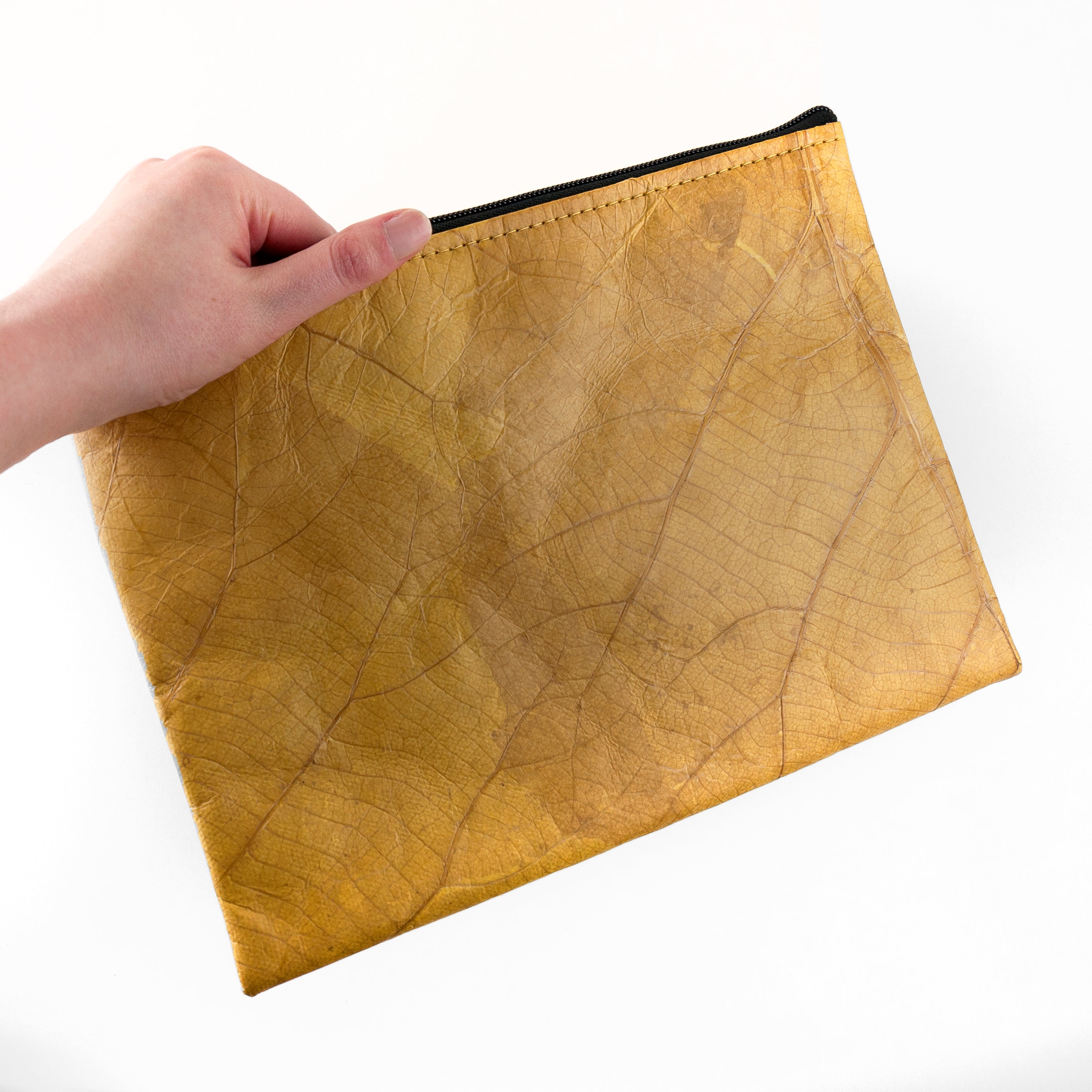 Our leaf leather is a cruelty-free, vegan alternative to leather, made from sustainably harvested teak leaves. The leaves are collected, dried and dyed with natural colours, then coated with a natural resin to preserve them and make them into the leather we use in our products.