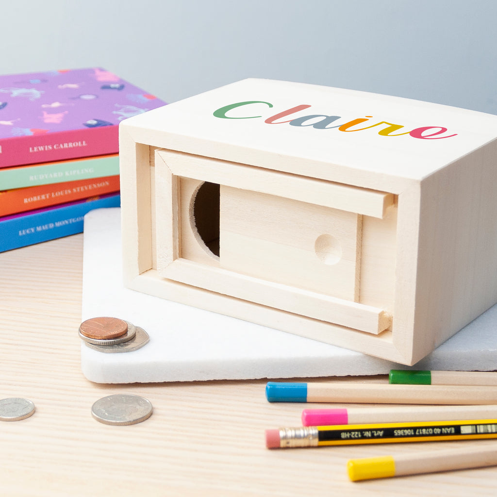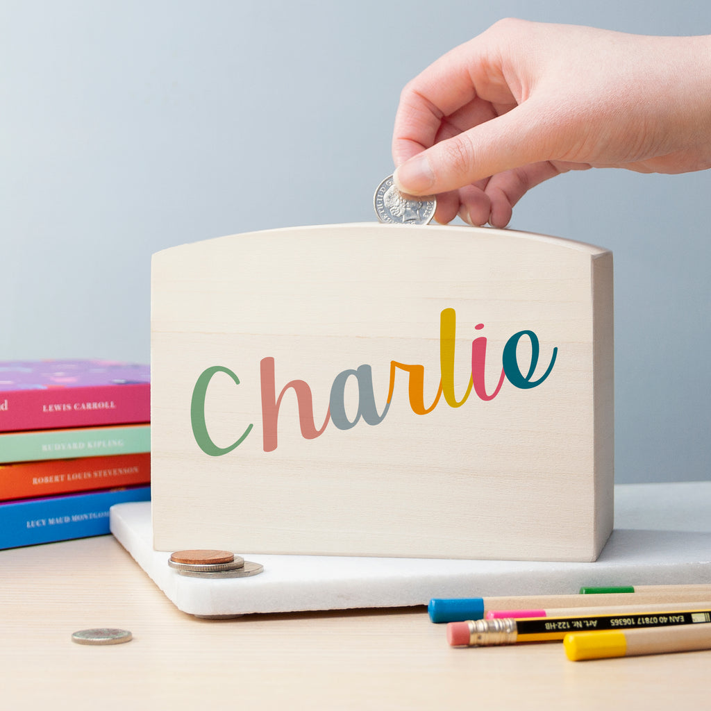A wonderful way to celebrate special moments while promoting saving money in a playful and memorable manner, our sleek wooden personalised children’s money box will make the ultimate birthday, Christening or Christmas gift for any little one!
