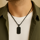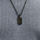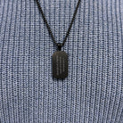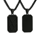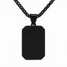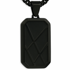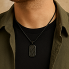 At the heart of the necklace lies a sleek, rectangular dog tag, finished in a deep black that exudes elegance. The surface is adorned with an eye-catching embossed cross hatching design - a dynamic interplay of lines that adds both texture and a sense of movement, catching the light subtly as it shifts. The effect is bold yet refined, offering a visual edge that’s effortlessly stylish and distinctly masculine.