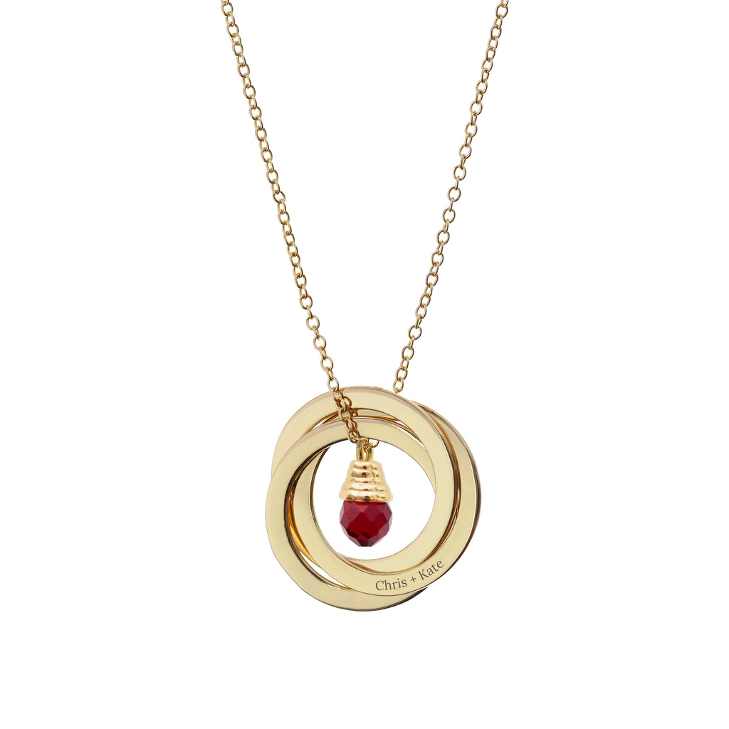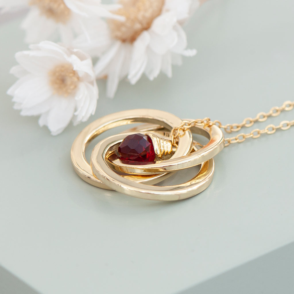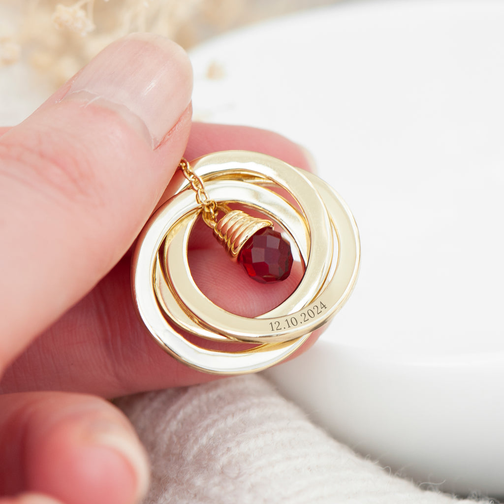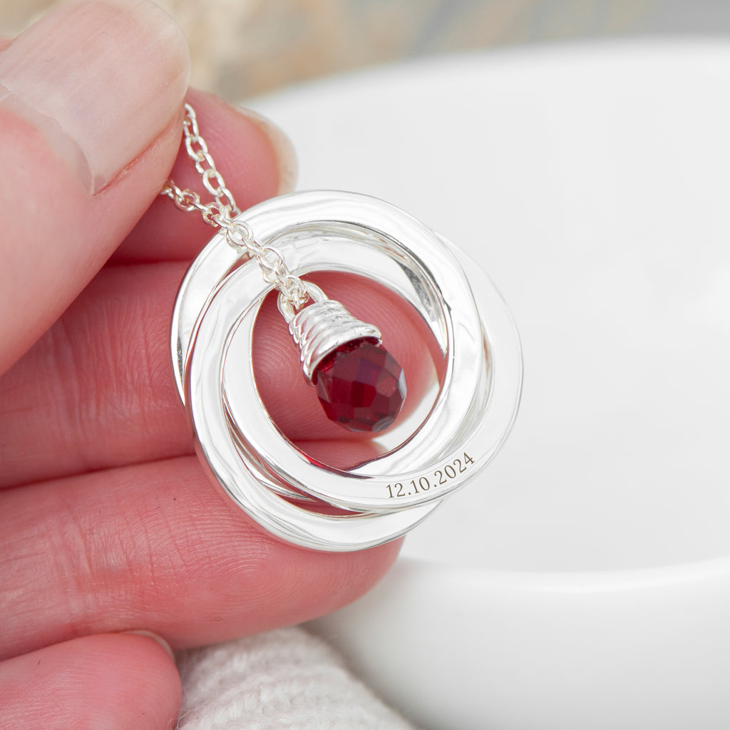A Russian Ring symbolises friendships or familial bonds and pays homage to the past, present, and future. This makes our stunning Personalised Russian Ring Garnet Crystal Necklace the perfect gift for a friend, partner or mum to show them how much they mean to you.