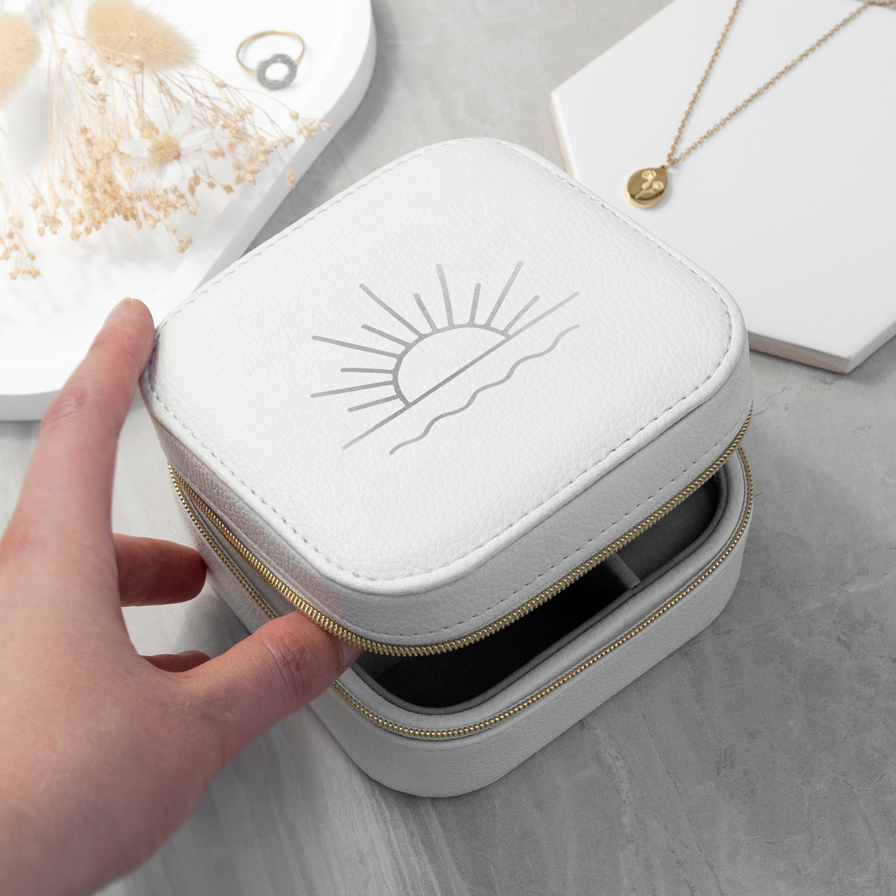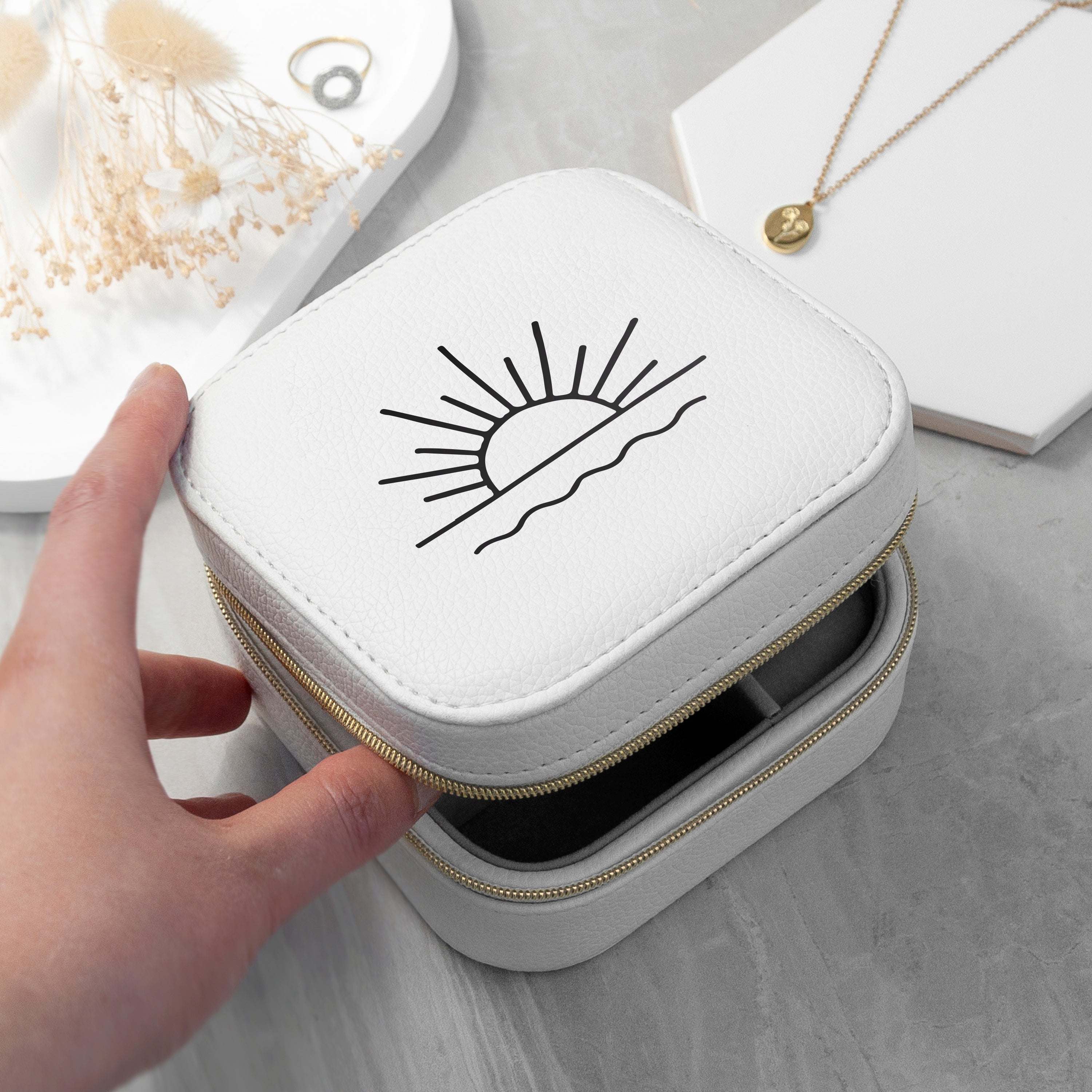 Elevate your travel look with our sensational Sunset White Square Travel Jewellery Case - where elegance meets functionality. Designed with the keen jetsetters in mind, this gorgeous, square-shaped trinket box boasts a serene white exterior and comes with a printed design that captures the calming essence of a sunset.
